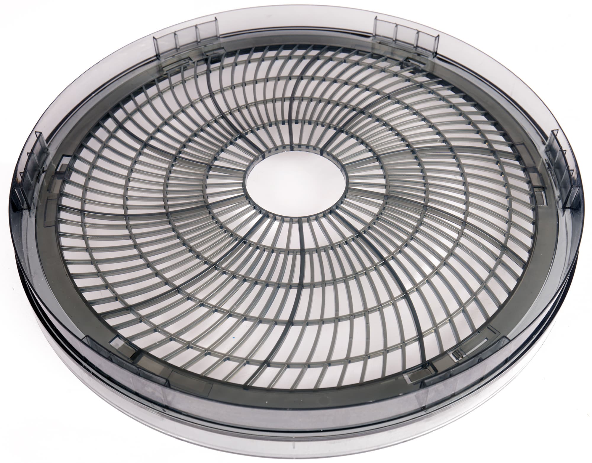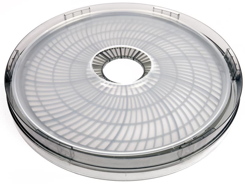 Пять поддонов диаметром 32 см и высотой 4 см, устанавливающиеся друг на друга, сделаны из темного просвечивающего пластика. Нами сразу были отмечены две небольшие, но приятные детали — ободок каждого поддона легко открепляется от перфорированного дна, что должно упростить процесс мытья и сушки; а также на каждом из пяти поддонов по кругу расположены специальные пластиковые выступы, которые при установке друг на друга позволяют увеличить высоту между лотками, а значит при желании можно будет засушить более крупные кусочки продуктов.