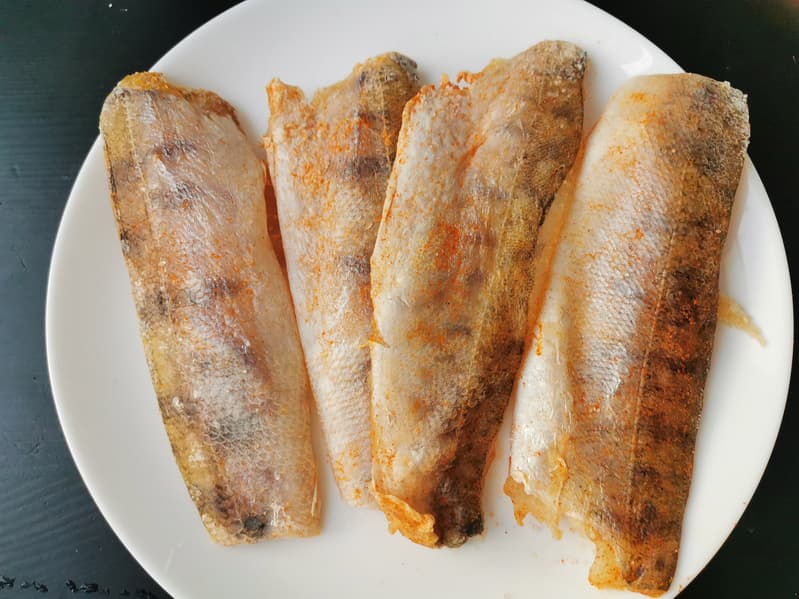 Мы взяли замороженные филе судака на коже и после медленной разморозки засолили. К соли был добавлен молотый кайенский перец.