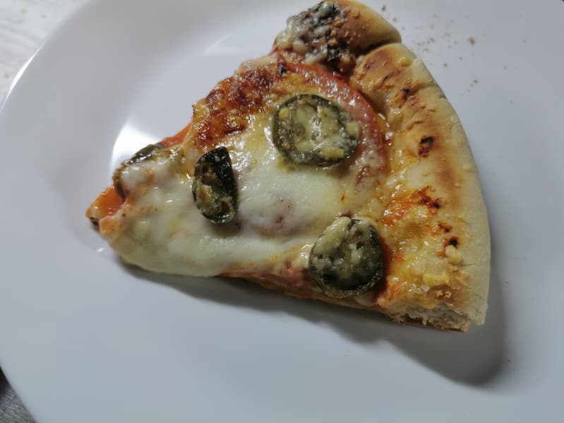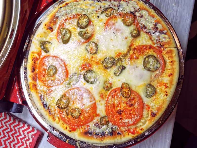 Далее мы раскатали тесто на доске, сформировав неидеальный круг для идеальной домашней пиццы, выложили на тесто начинку — острый томатный соус собственного приготовления, томаты, моцареллу, халапеньо и тертый пармезан. После чего переместили заготовку на разогретую каменную мини-печь и засекли 15 минут.