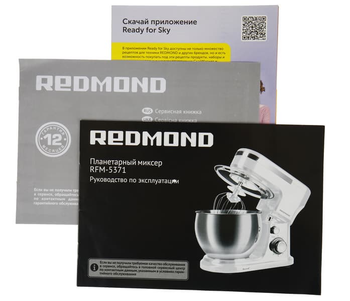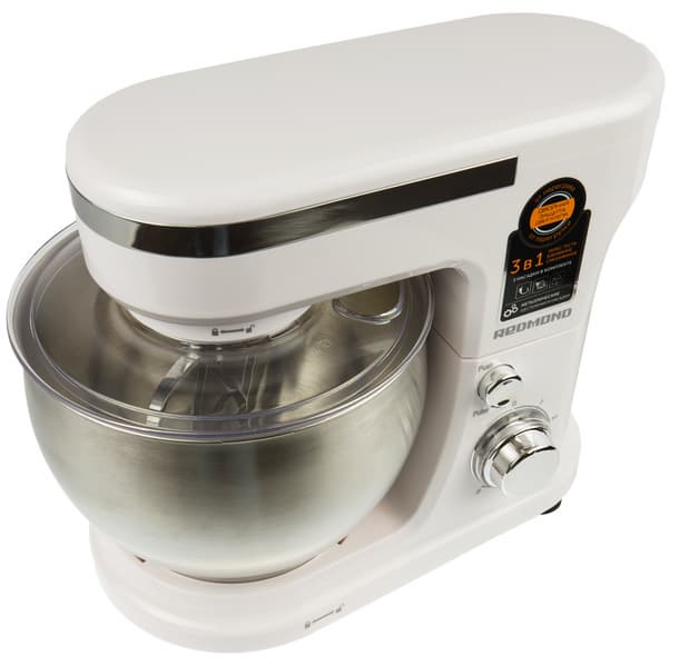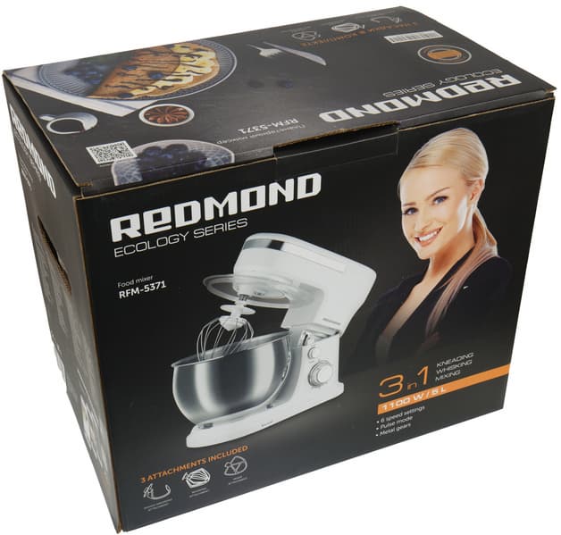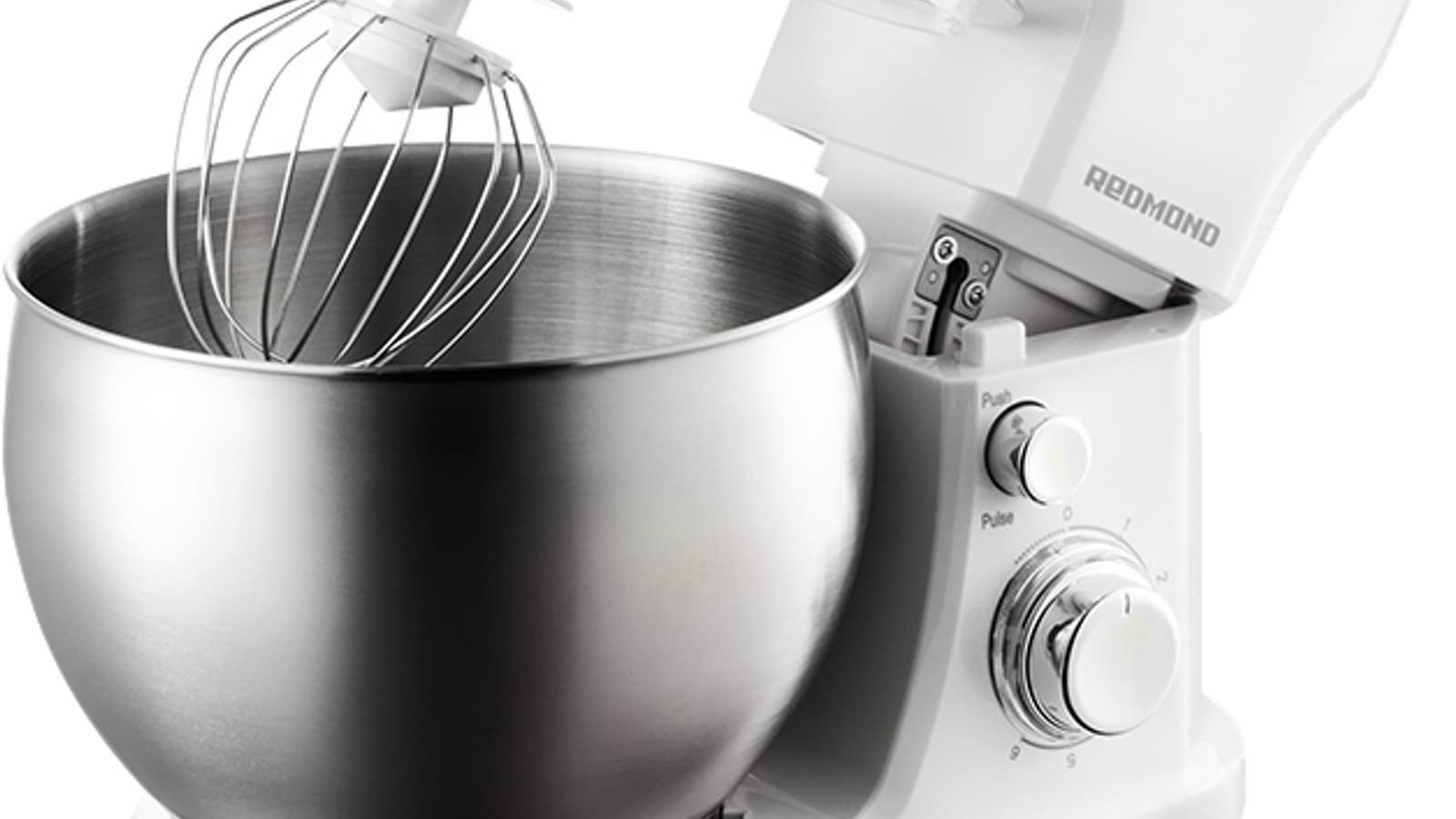К нам на тест прибыл планетарный миксер RFM-5371 компании Redmond. Прибор выглядит просто, надежно и аккуратно. В комплекте к нему идут 3 съемные насадки — крюк для замешивания теста, венчик для взбивания, а также насадка для смешивания мягких продуктов. Мы детально рассмотрим тестомес в нашем обзоре, а заодно проведем ряд проверок и приготовим с его помощью несколько подходящих блюд.