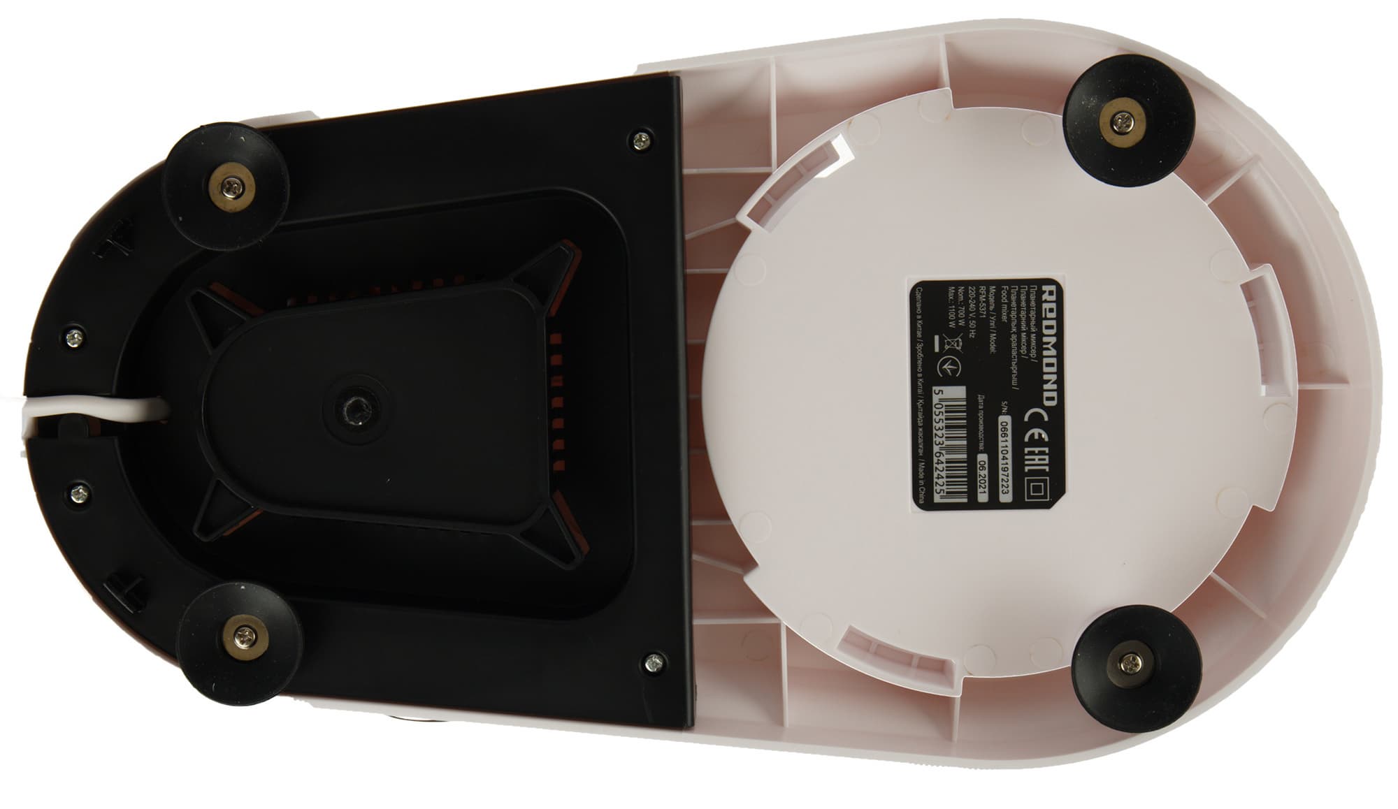 Углы прибора закруглены, и в каждом из них расположена резиновая ножка-присоска. Благодаря ножкам миксер может неподвижно стоять на столе даже при воздействии на него, а чтобы «отлепить» его от поверхности, понадобится приложить усилие.