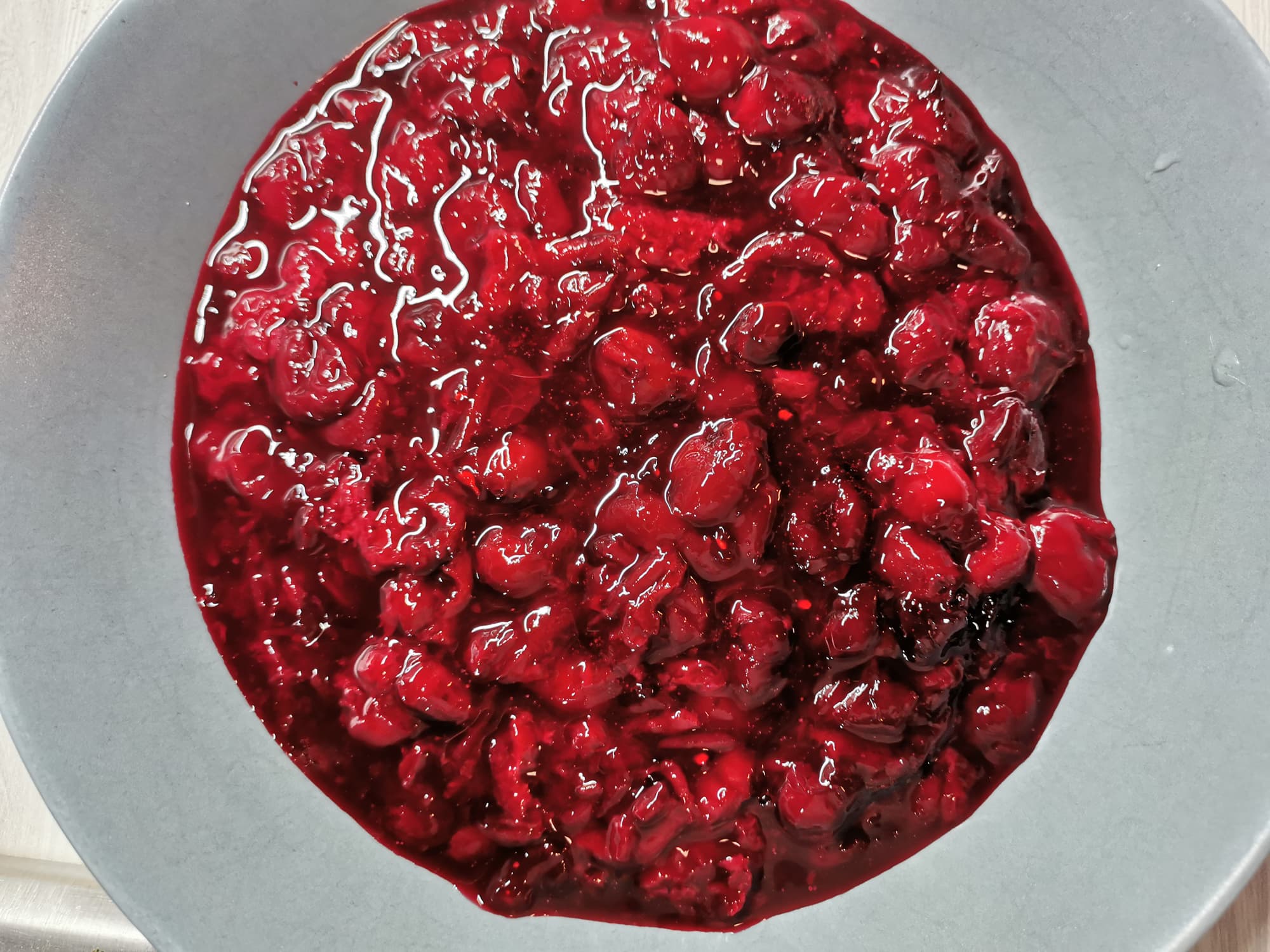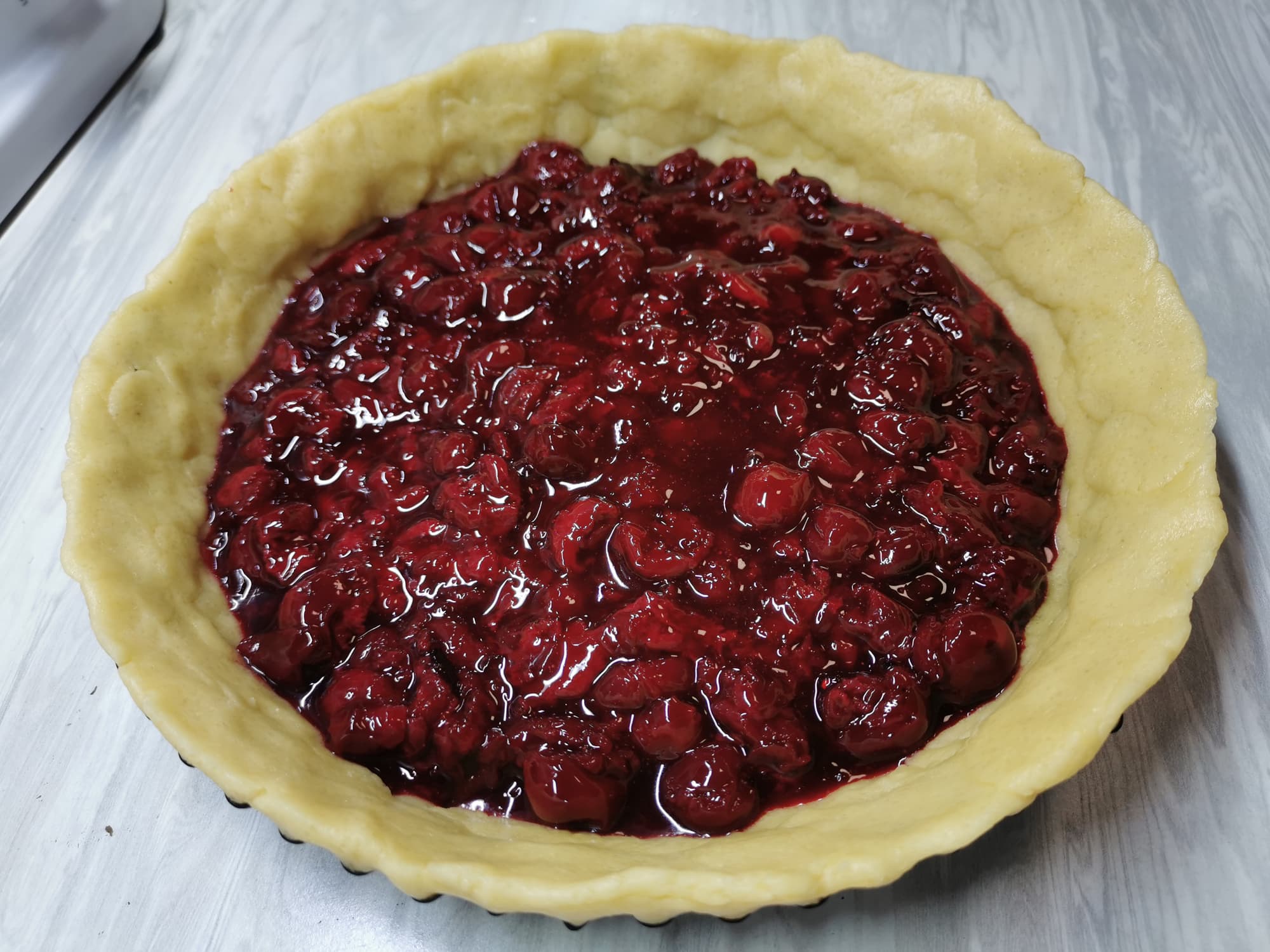 Когда вишневая масса остыла, мы выложили ее в форму на тесто.