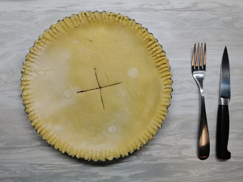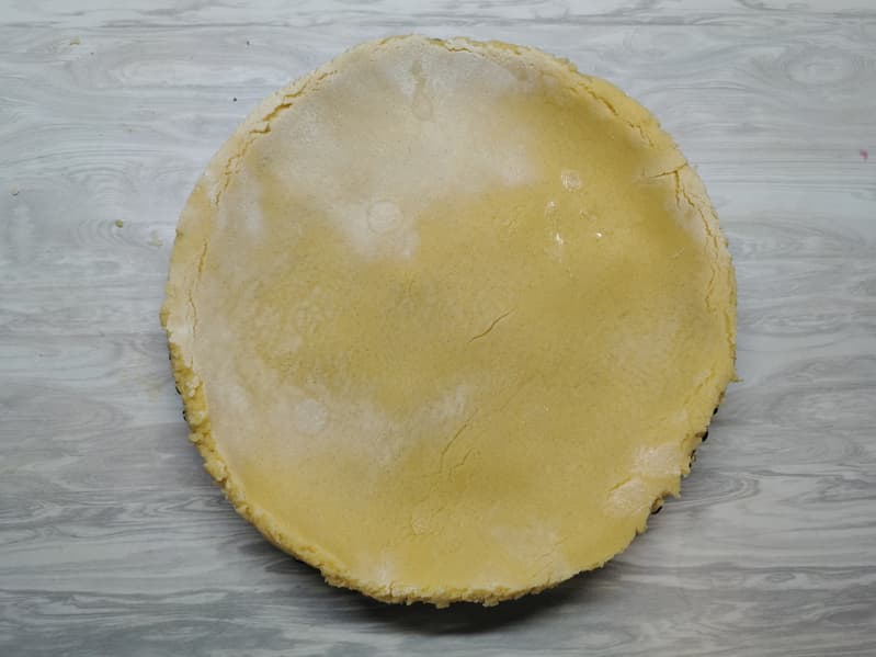 Мы поставили духовку разогреваться до 180 градусов и занялись вторым пластом теста — смочили его по краям водой и накрыли им форму с заготовкой.
