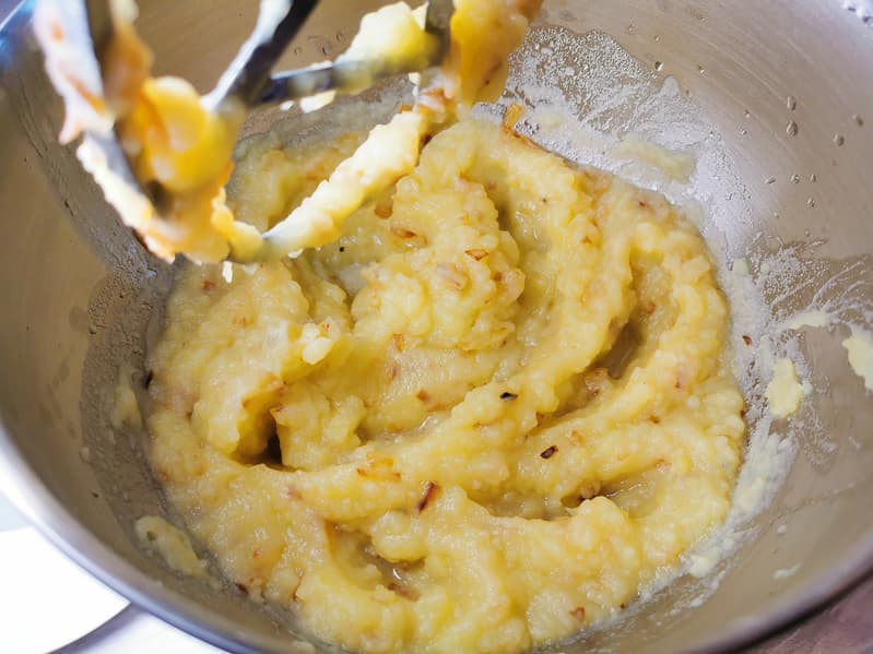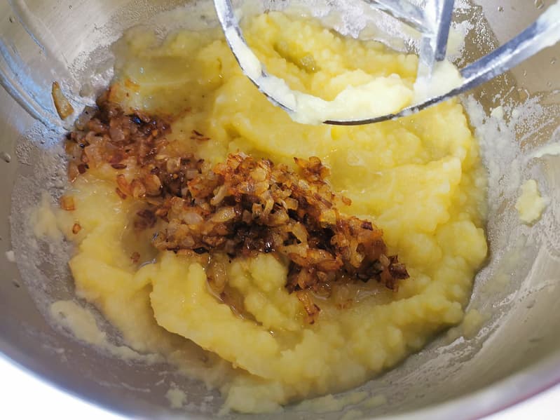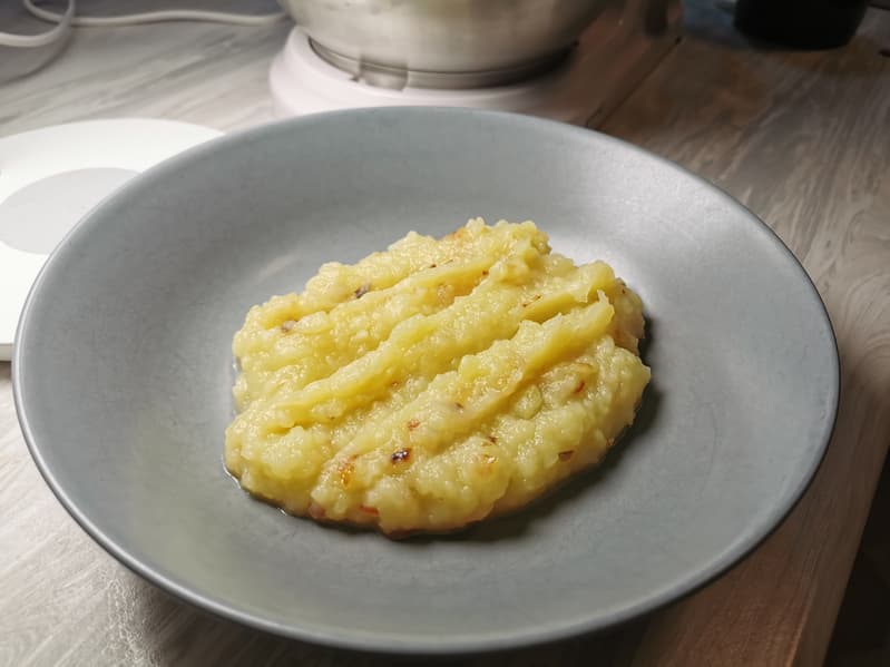 В полученное пюре мы добавили уже готовый к тому времени жареный лук и вновь включили прибор для получения равномерно перемешанного гарнира.