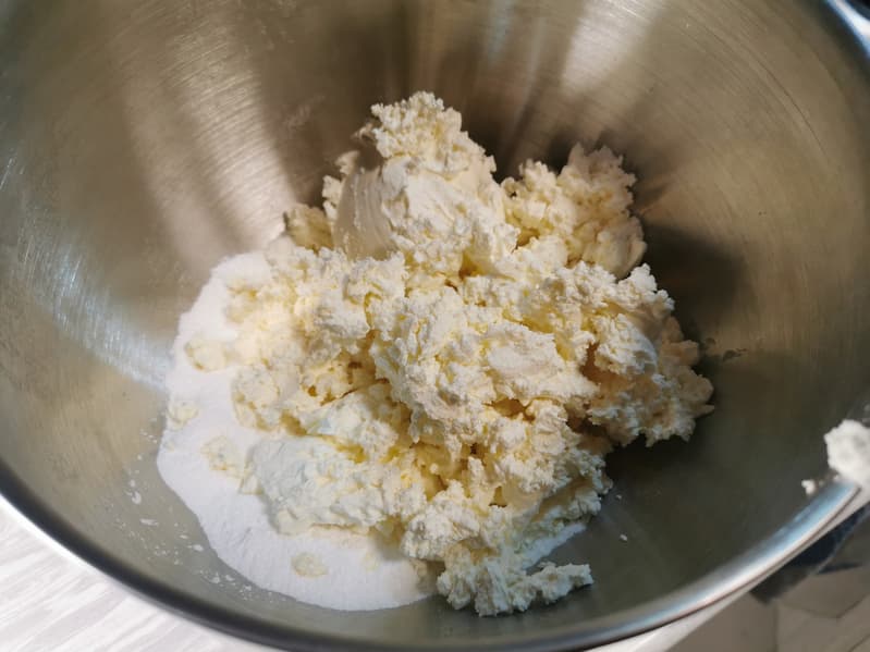 В чашу к пудре отправилось 600 г творожного сыра и мы запустили работу миксера.