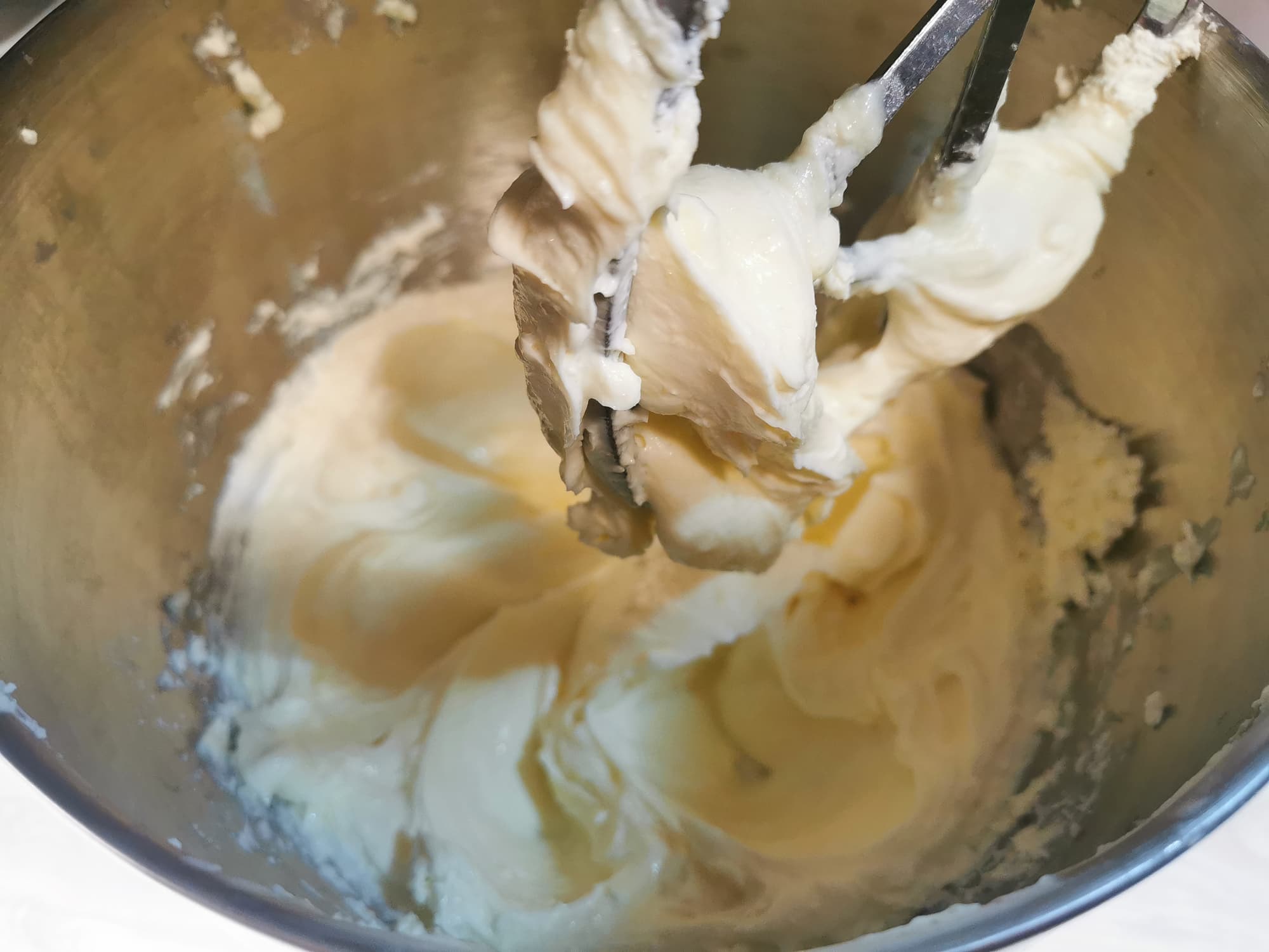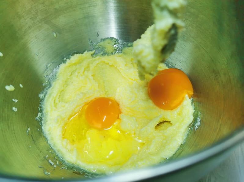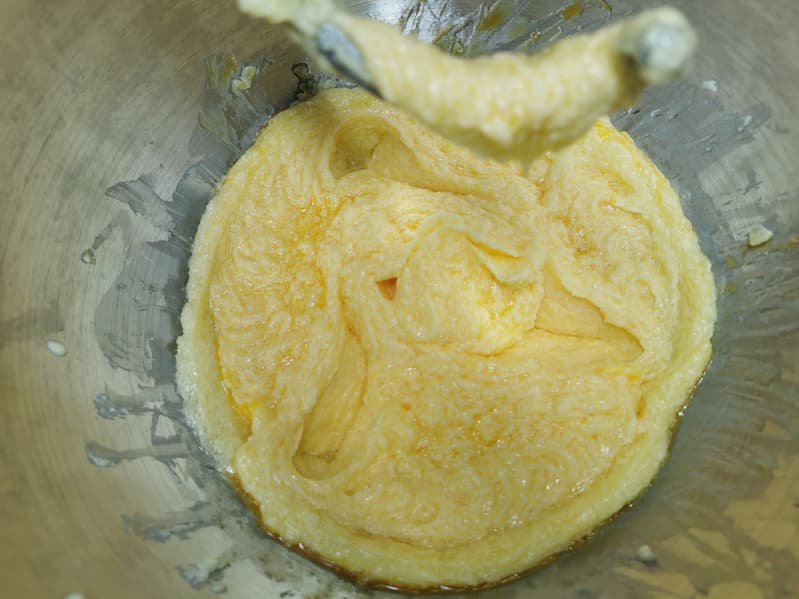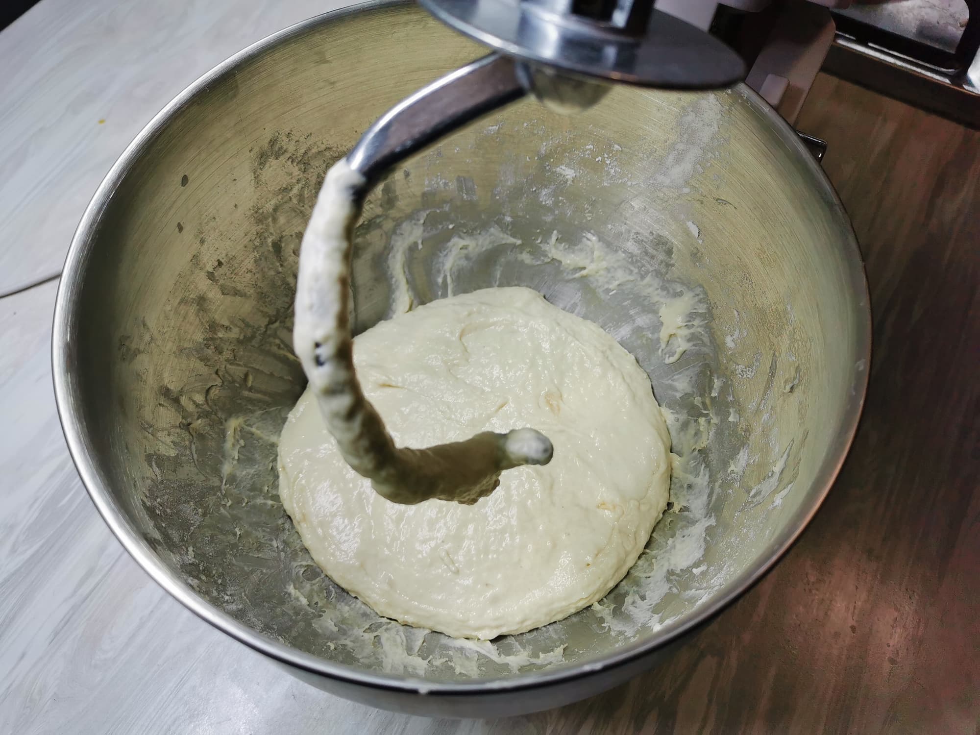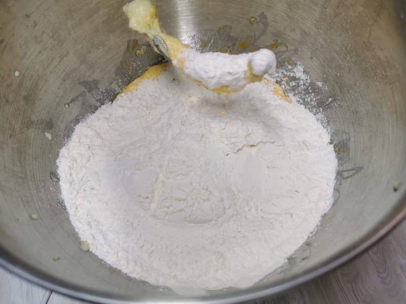 Далее мы добавили яйцо и желток и включили миксер на втором режиме еще на 1,5 минуты. В конце мы добавили муку и замешивали наше тесто 3 минуты на первом режиме.