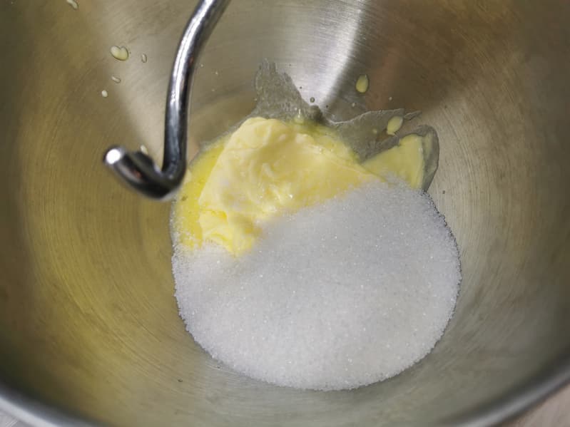 Сливочное масло мы размягчили на водяной бане и добавили к нему сахар. После чего минуту их замешивали на втором режиме.