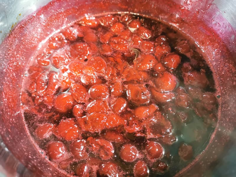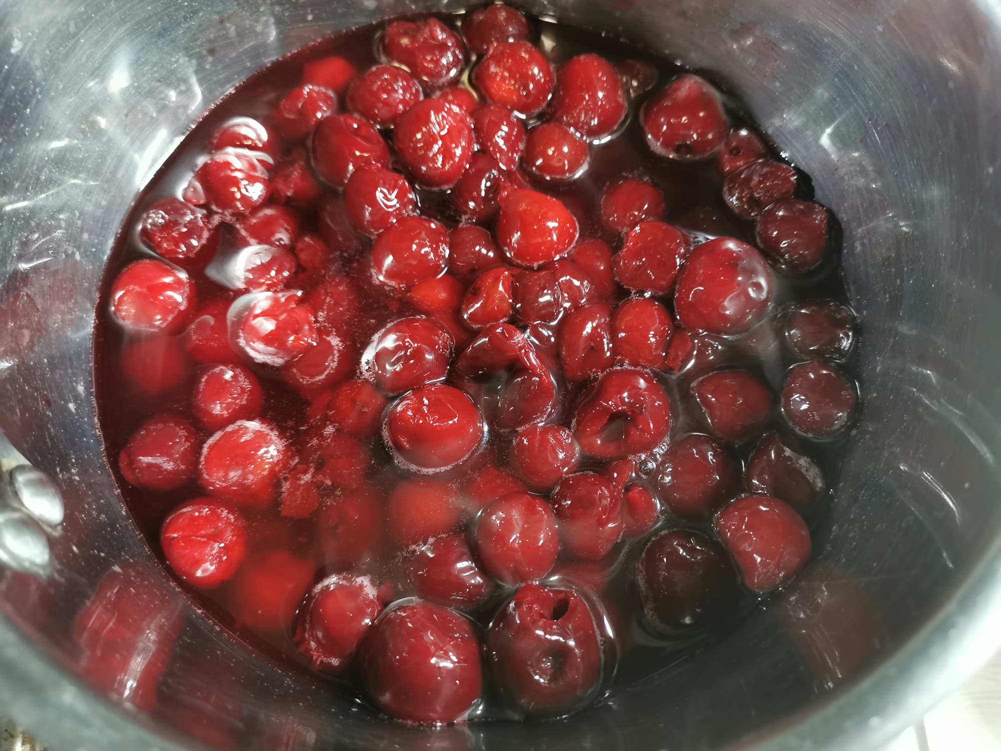 Когда вода закипела, мы добавили в нее вишню и 5 минут варили ее, дожидаясь появления сиропа.