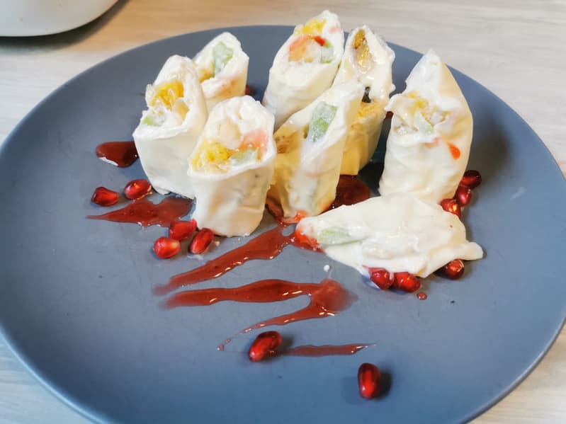 Спустя отведенное время мы вынули рулетики из холодильника и разрезали необходимое количество порций на кусочки. При подаче мы украсили их клубничным соусом и зернами граната.