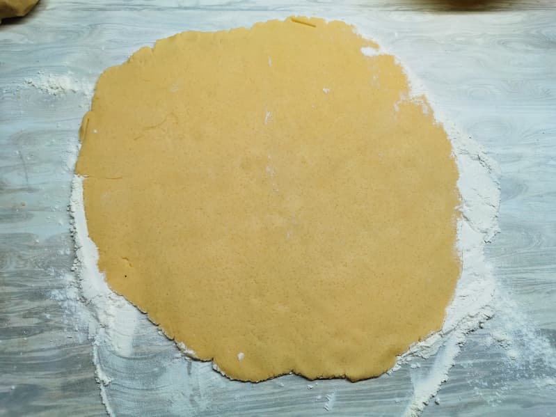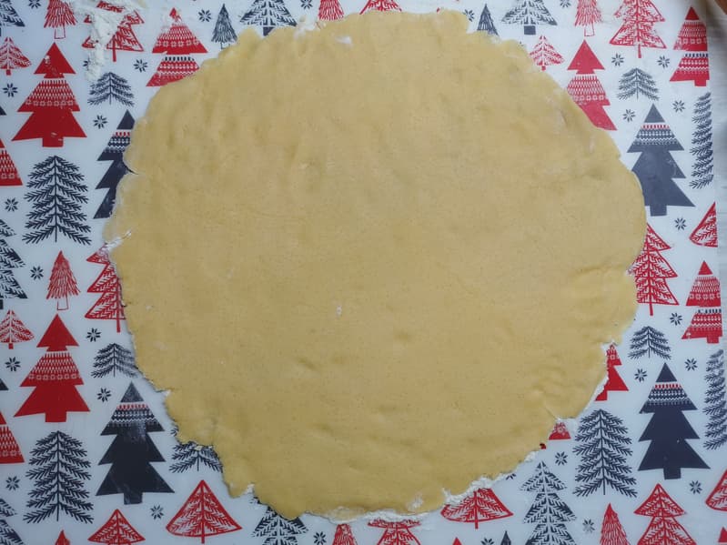 Тем временем мы разделили тесто на два шарика и из каждого раскатали округлый пласт толщиной до 0,5 см и диаметром не менее 23 см, так как наша форма для пирога имеет 21 см в диаметре.