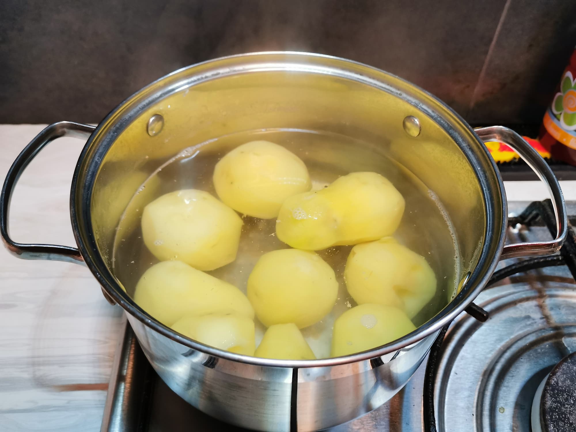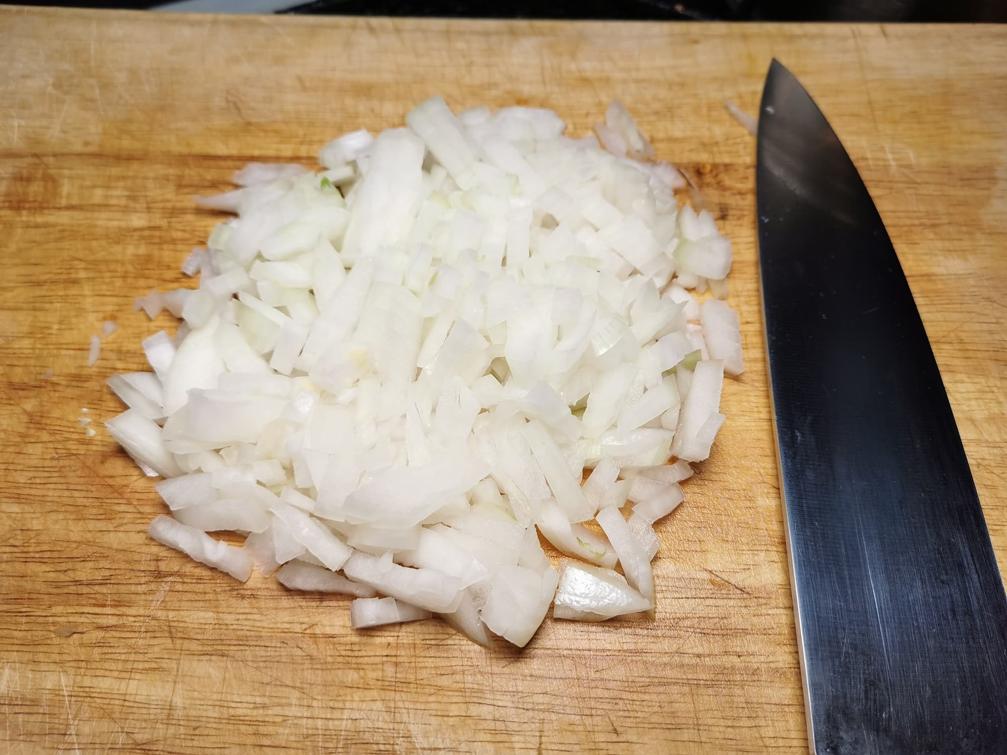 Чтобы проверить насадку для смешивания мягких ингредиентов мы взялись за приготовление картофельного пюре жареным луком. Для этого мы предварительно отварили и посолили 9 средних картофелин и мелко нарезали 1 репчатую луковицу.