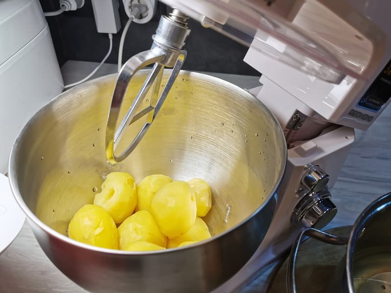 К отварному картофелю мы добавили 20 граммов сливочного масла и, включив миксер, стали через окошко в защитной крышке постепенно вливать стакан горячей воды.