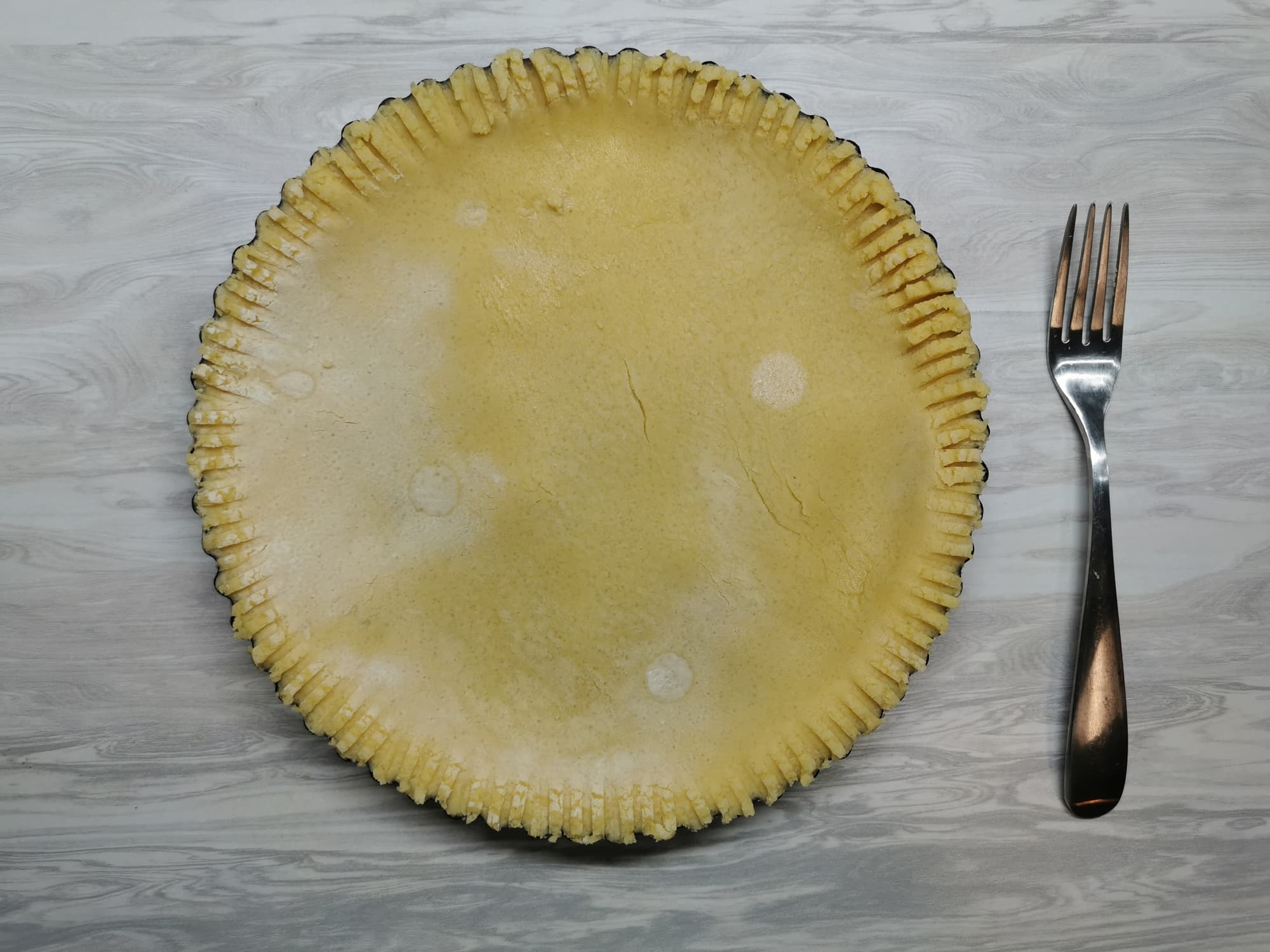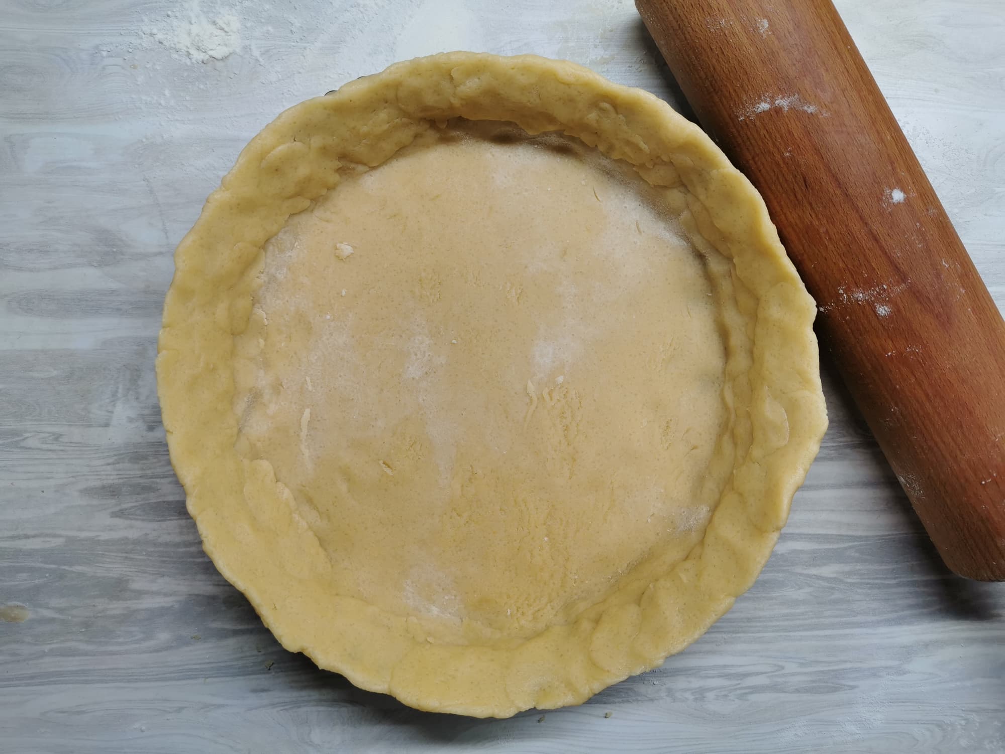 Первый пласт мы разместили в форме, оставив тесто слегка торчать над бортами.