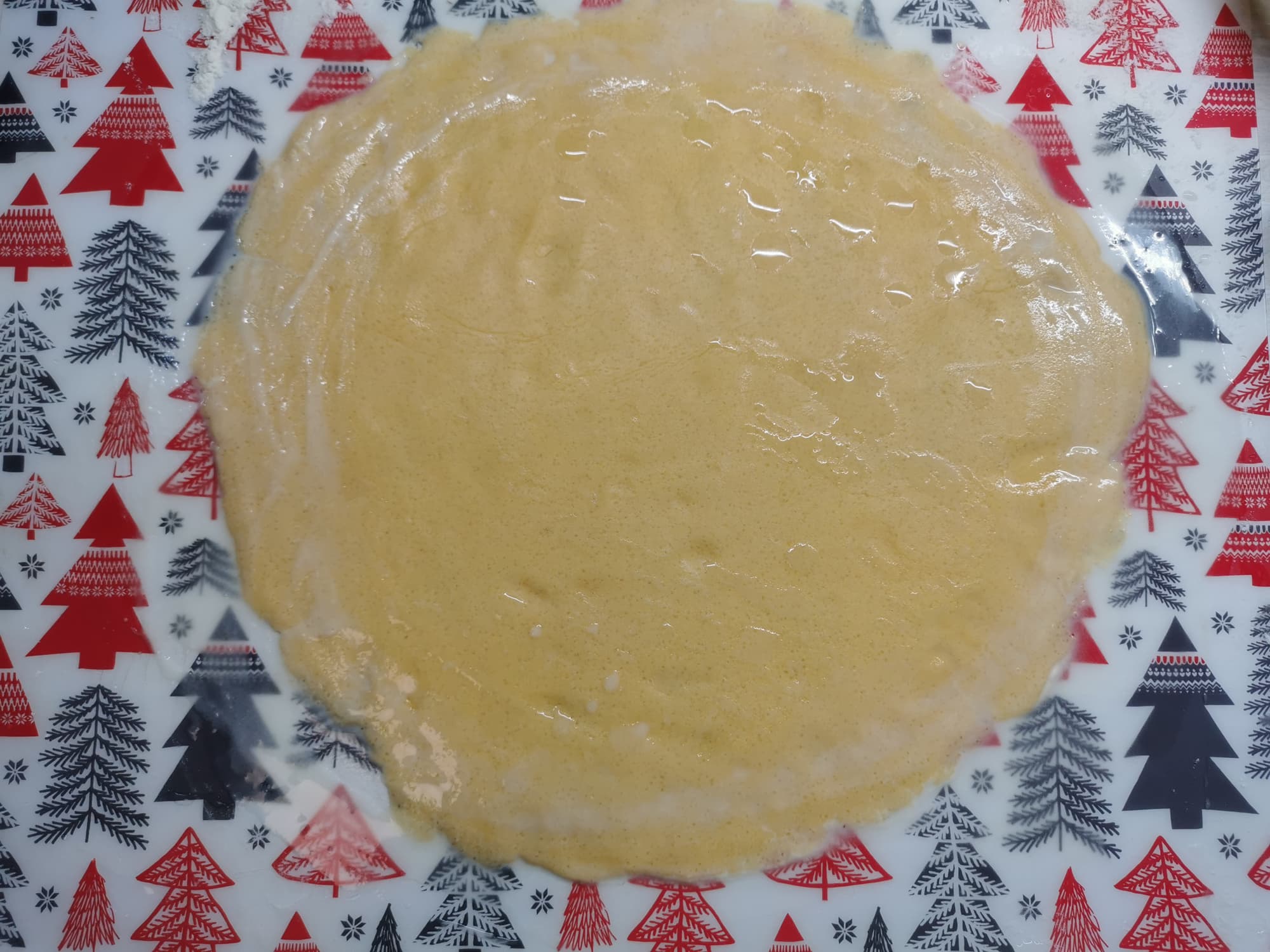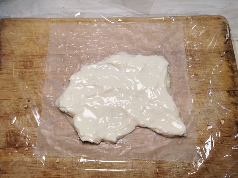 Далее мы вымачивали по одному листу рисовой бумаги в воде комнатной температуры, чтобы сделать их пластичными и выкладывали на них порцию крема, равномерно размазывая его по всей поверхности, отступая около 1,5 сантиметров от каждого края.