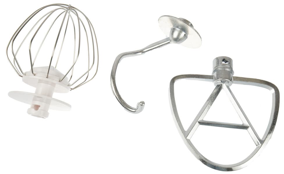 В комплекте идут три насадки: венчик для взбивания, крюк для замешивания теста, насадка для смешивания мягких продуктов. У венчика 6 стальных дуг, крюк и насадка для смешивания силуминовые.