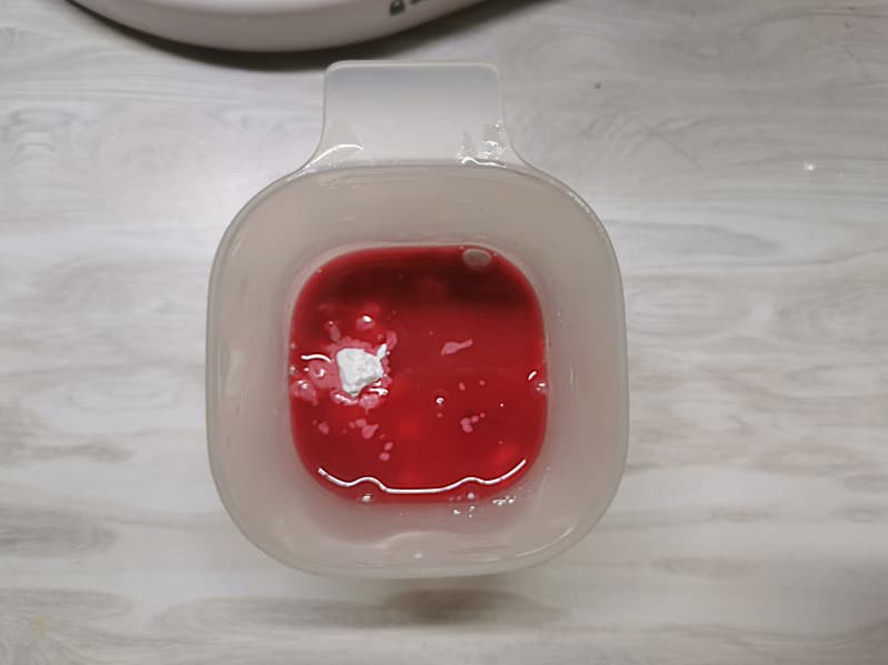 Когда начал появляться сироп, мы взяли 2 столовые ложи кукурузного крахмала и 2 столовые ложки сиропа из кастрюли и тщательно их смешали до получения полностью однородной жидкости.