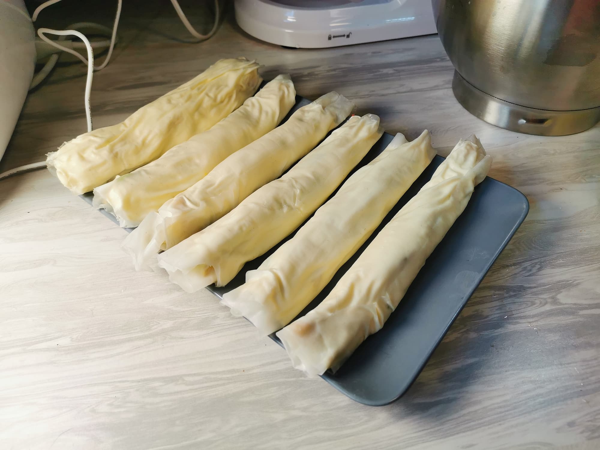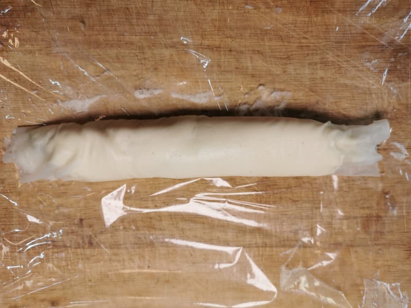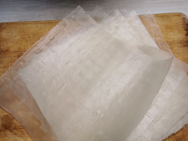Для удобства мы обернули разделочную доску пищевой пленкой — так мокрые листы рисовой бумаги намного легче отклеиваются от поверхности и дальнейшее сворачивание их в рулет занимает всего несколько секунд.