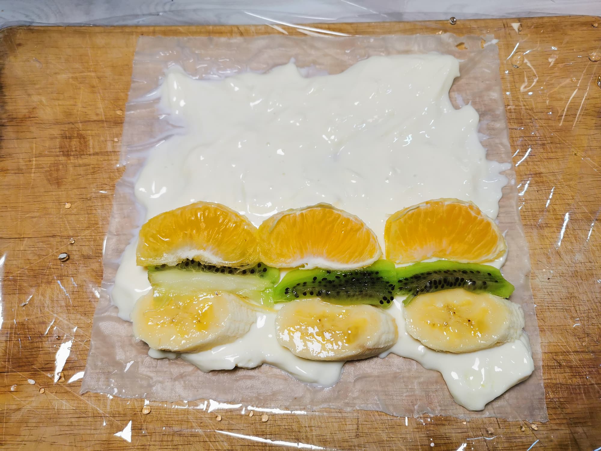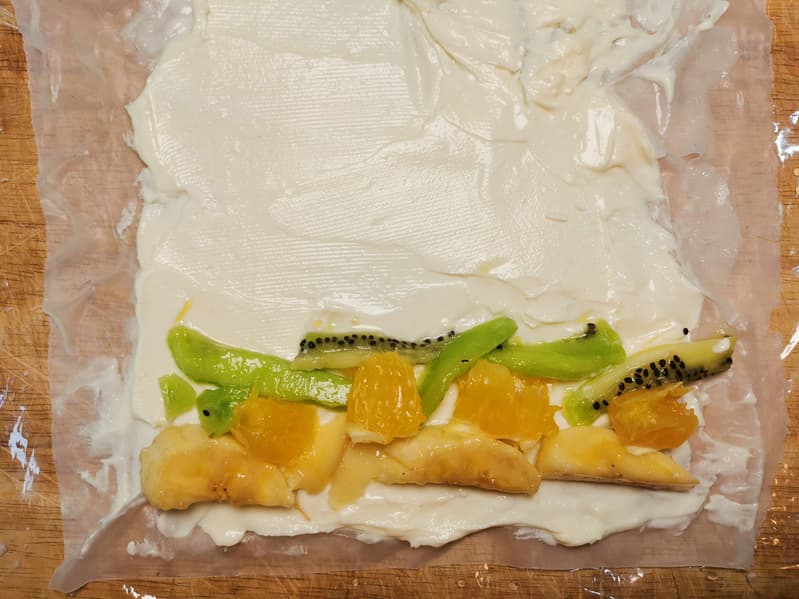 Перед скручиванием на одну из сторон мы положили заранее очищенные и порезанные фрукты. Как выяснилось в дальнейшем, дольки нашего апельсина были слишком крупными, поэтому первый ролл получился весьма объемным.