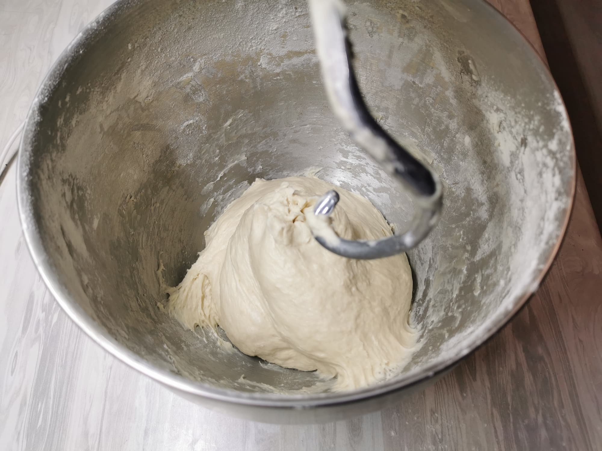 По рецепту нам нужно было сохранить тесто слегка влажным и очень мягким, но в первый раз мы немного промахнулись с количеством муки и спустя 3 минуты активного замеса на третьем режиме получили чересчур влажное тесто.