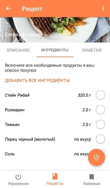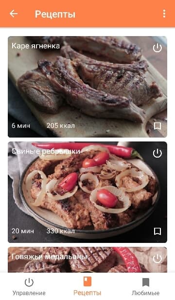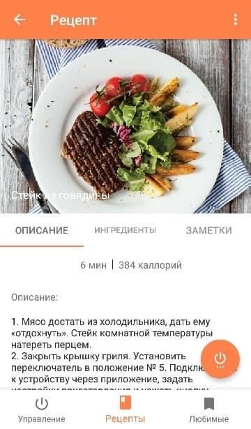 Процедура механического управления грилем довольно проста и не вызывает затруднений. Что касается управления с мобильного устройства, то интерфейс приложения понятен и нагляден. Наиболее ценна, по нашему мнению, возможность установить таймер, по завершении времени которого отключится нагрев панелей. Функции отложенного старта или подогрева готового блюда, конечно же, могут быть востребованы, но при жарке хорошей отбивной или стейка они представляются избыточными. Список рецептов довольно любопытен и хорошо организован.