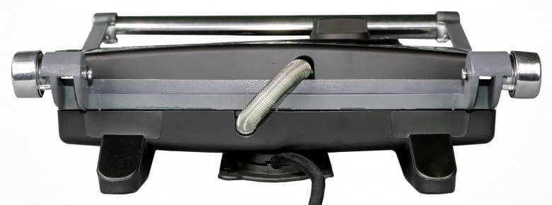 Если взглянуть на обратную сторону корпуса, то можно увидеть шнур электропитания, кабель, соединяющий нижнюю и верхнюю панели, и выступающие за пределы дна ножки. Ножки играют роль ограничителей, не позволяющих установить гриль вплотную к стене или мебели. Это предохраняет от воздействия температуры поверхность и покрытие стола или стен.