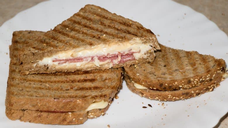 Ломтики хлеба смазали сырным соусом, уложили кусочек сыра и ветчины. Жарили в разогретом до 4-го режима гриле около 4-5 минут.