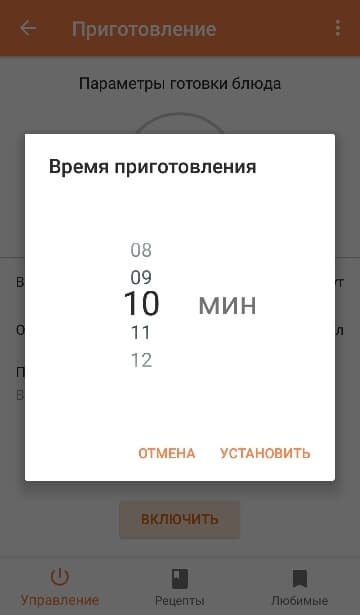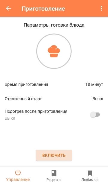 Информация и диалоговые окна, которые появляются на экране телефона или другого мобильного устройства, представлены на следующих скриншотах. Так, нажав на «Приготовление», пользователь оказывается на страничке, где можно установить время приготовления, отложить старт нагрева и включить функцию подогрева после приготовления.