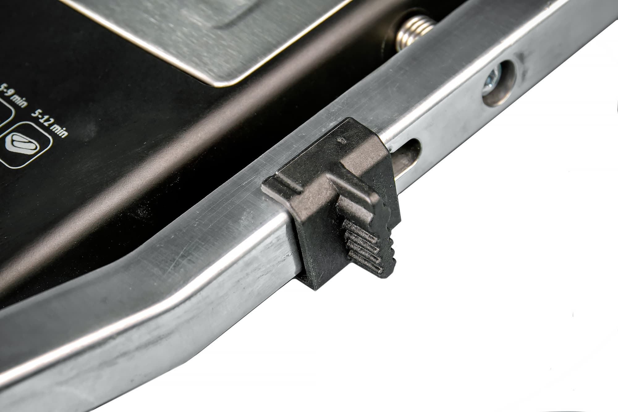 Шарнирное соединение откидной части гриля к ручке обеспечивает автоматическую регулировку расстояния между жарочными панелями в зависимости от толщины продукта.