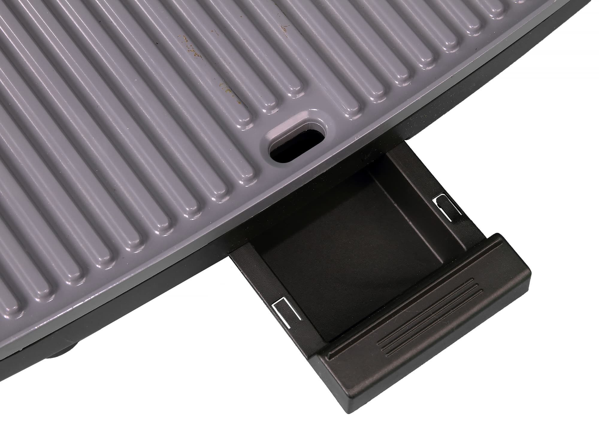 Раскрыв гриль, можно увидеть панели стандартной формы и рифленого рисунка. По центру передней стороны нижней панели имеется отверстие, сквозь которое жидкость и жир будут стекать в предназначенный для этого контейнер.