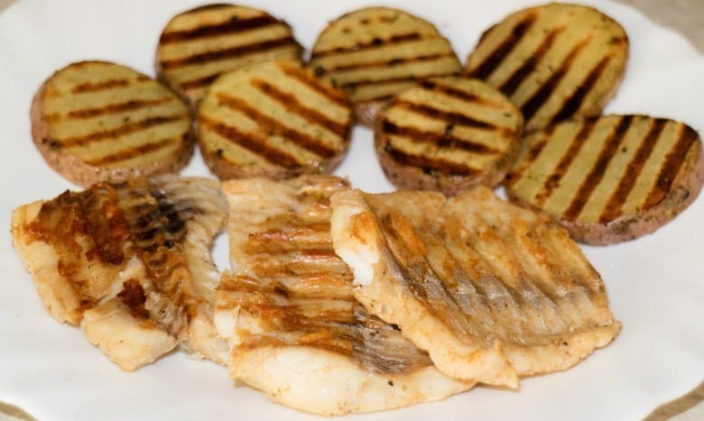 Как всегда, скорость приготовления пищи в контактном гриле нас порадовала. За 15 минут к столу было подано полноценное горячее блюдо — жареная рыба с картофелем.