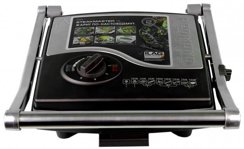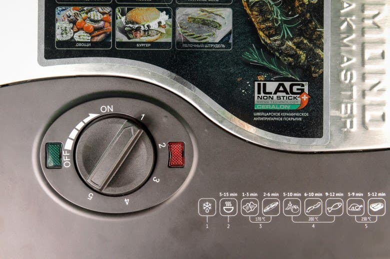 Регулятор переключения температурных режимов вращается по окружности свободно, без пошагового переключения. Гриль может работать в пяти температурных режимах. Подсказки в виде пиктограмм, нанесенные справа на корпусе крышки, помогают пользователю сориентироваться как с режимами, так и со временем жарки некоторых продуктов.