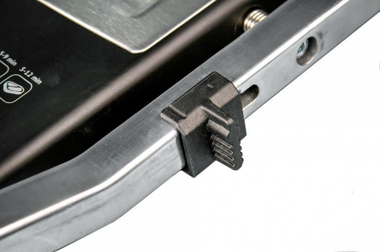 - Фиксатор высоты нам ни разу не понадобился, так что данная деталь играет существенную роль лишь при хранении гриля, предотвращая случайное раскрытие панелей, надежно фиксируя прибор в сложенном состоянии.
