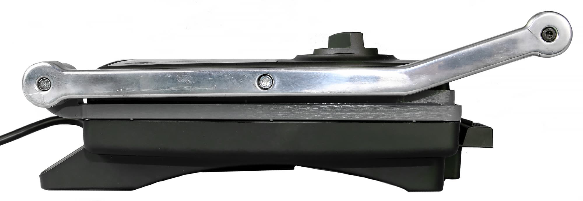 На правой стороне ручки находится фиксатор положения крышки гриля, удерживающий панели в сложенном состоянии, что особенно актуально при перевозке или хранении устройства. Фиксатор передвигается по горизонтали вдоль ручки. Крышку гриля можно установить в двух положениях на разной высоте от нижней пластины: когда крышка вплотную соприкасается с нижней пластиной и когда крышка находится примерно в одном сантиметре над нижней пластиной.