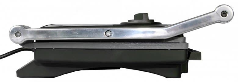 - Высота между панелями регулируется толщиной помещаемого в гриль продукта. Верхняя панель при этом располагается практически строго горизонтально, благодаря чему часть продукта, размещенная в глубине, не сдавливается.