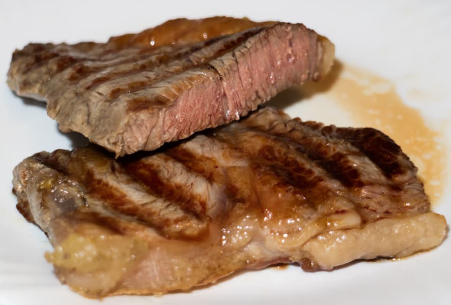 Жарили ровно 3 минуты. Стейк достиг стадии medium — средней прожарки — ярко выраженная зажаренная корочка снаружи и розовато-красная мякоть внутри. Отличный результат.