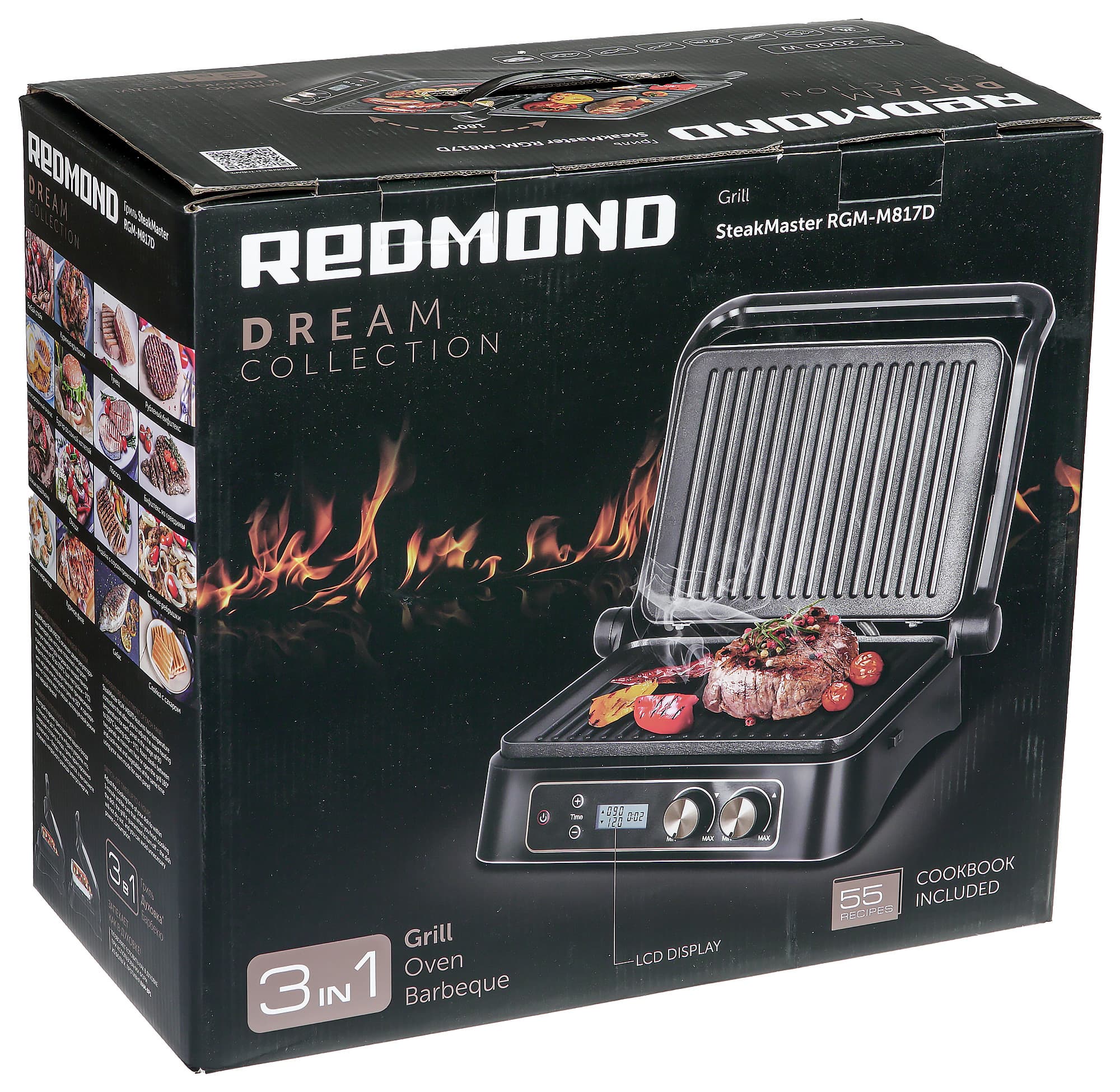 Электрический гриль Redmond SteakMaster RGM-M817D может выступать в роли трех кухонных приборов: контактного гриля, жаровни и духовки. Прибор оснащен двумя съемными панелями с антипригарным покрытием, может работать в полностью разложенном на 180° виде, а при наличии специального противня или фольгированных пакетов можно готовить внутри гриля запеканки, омлеты, рагу и выпечку.