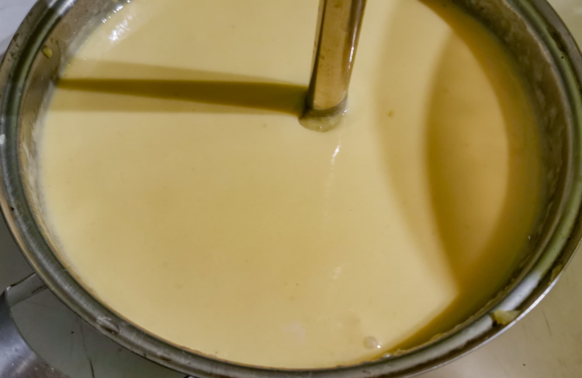 Затем поменяли насадку и погружным блендером довели пюре до гладкого состояния.