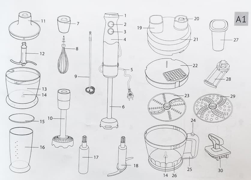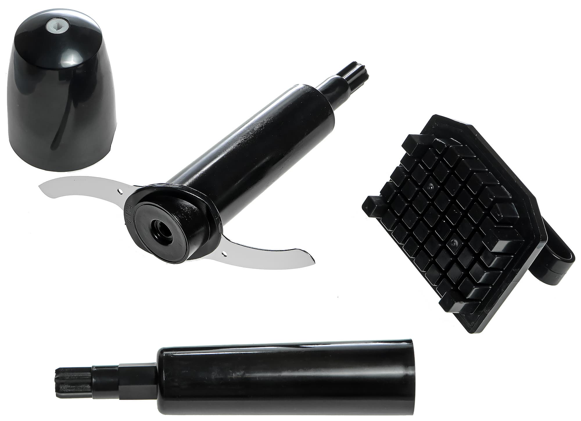 S-образный нож малой и большой чаши — нержавеющий. Втулка-переходник, приспособление для очистки решетки нарезки кубиками, и переходник для венчика изготовлены из пластика.