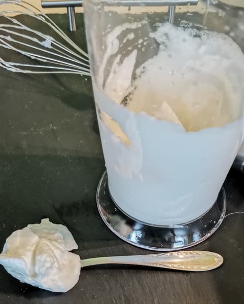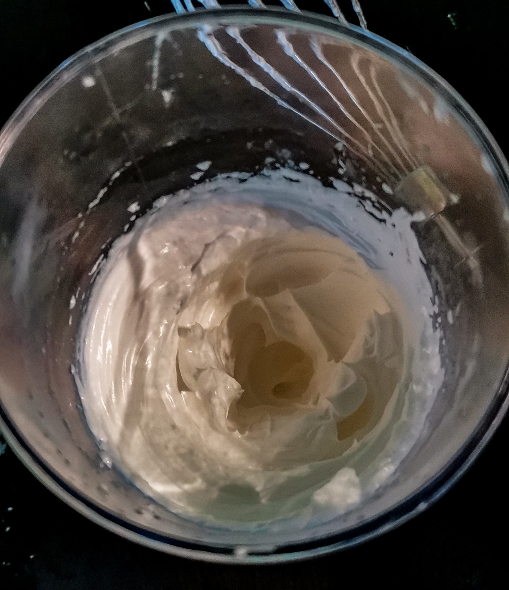 Мы взяли 1 яичный белок и взбили его в стакане венчиком за 30 секунд. Белок взбился до твердого состояния. В стакане для взбивания могут поместиться максимум 2 белка.