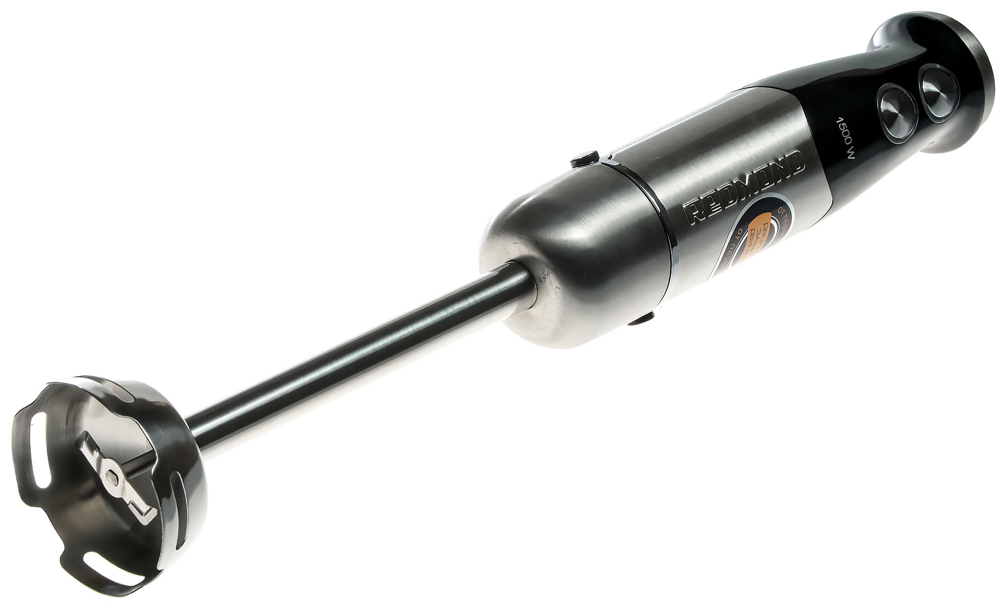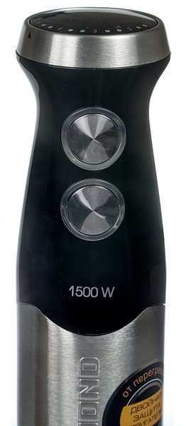 Redmond RHB-2964 с таким обилием опций и деталей сложно назвать блендером, скорее это компактный кухонный комбайн. Основная часть всего комплекта — блок электродвигателя. Это небольшой, тяжелый металлический цилиндр с двумя кнопками управления в верхней части и гнездом присоединения в нижней. Блок вставляется в крышку-редуктор чаш или соединяется через переходник с насадками, венчиком и взбивателем. Блендерные насадки и блендер для пюре присоединяются к блоку двигателя без переходников.
