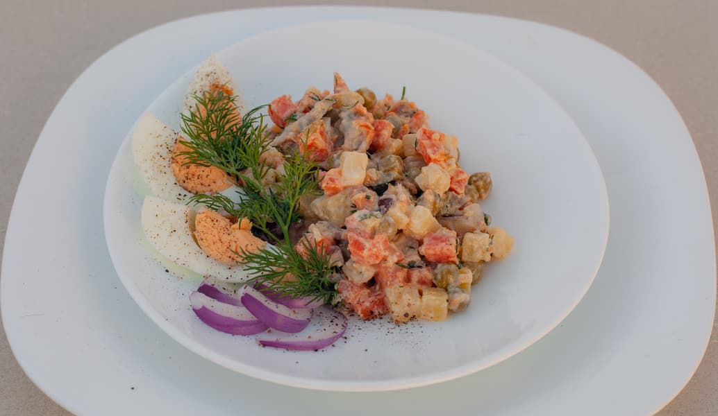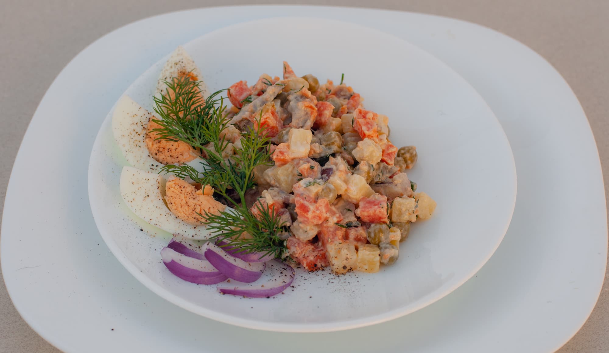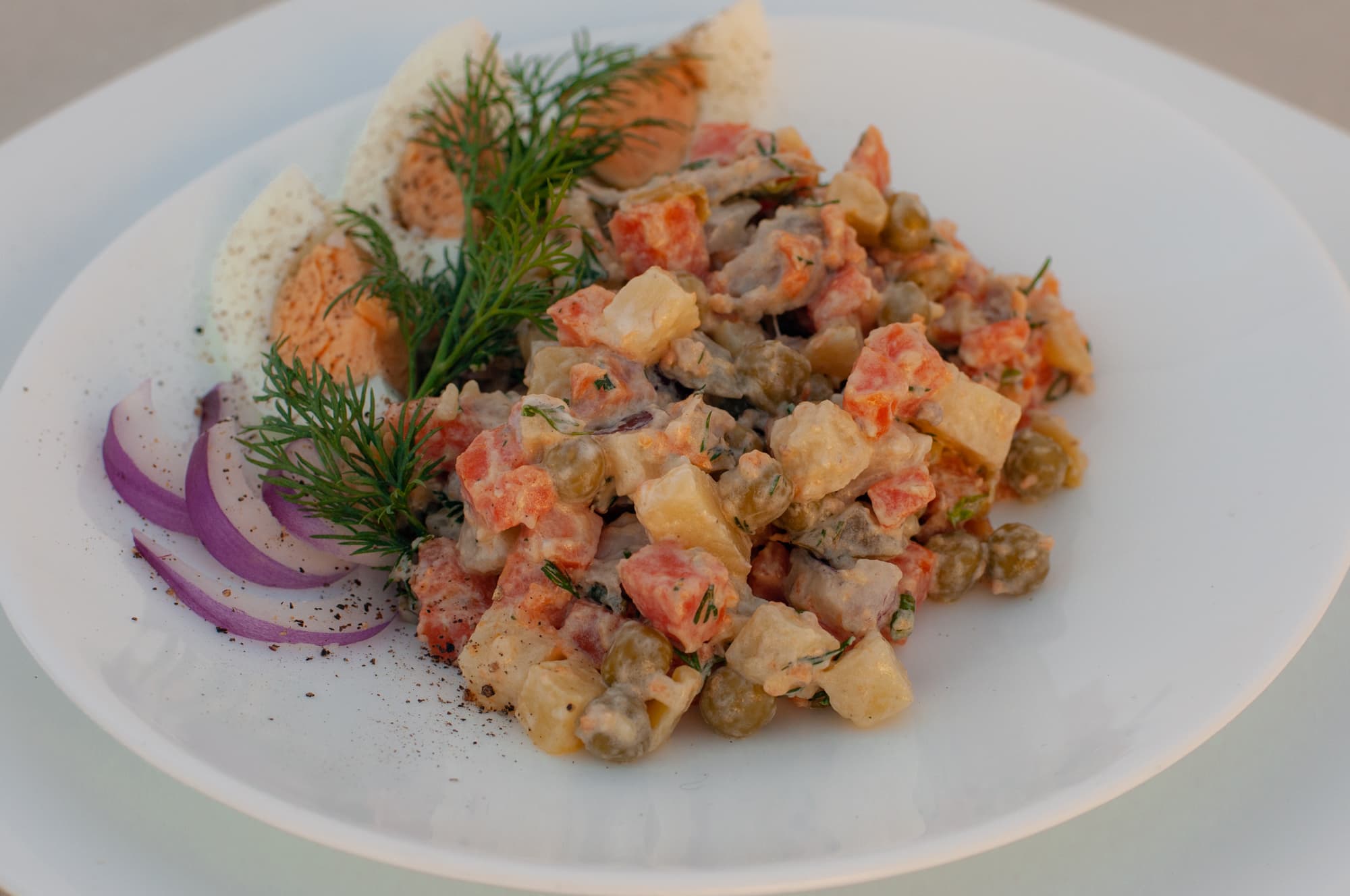 Мы добавили горошек, мясо и майонезную заправку, и салат был готов.