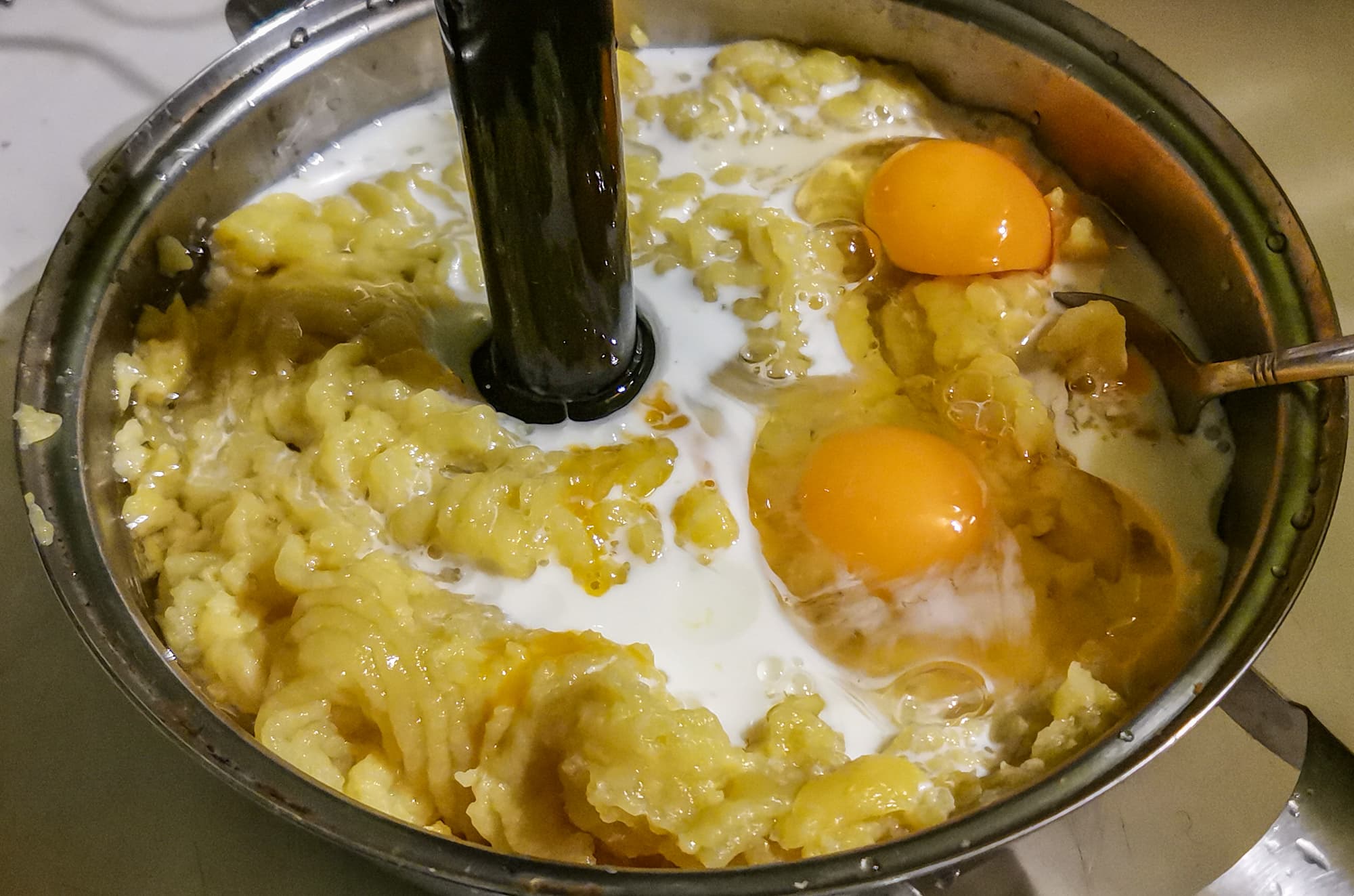 Добавили в пюре яйца, соль, молоко и масло и измельчали еще 1 минуту.
