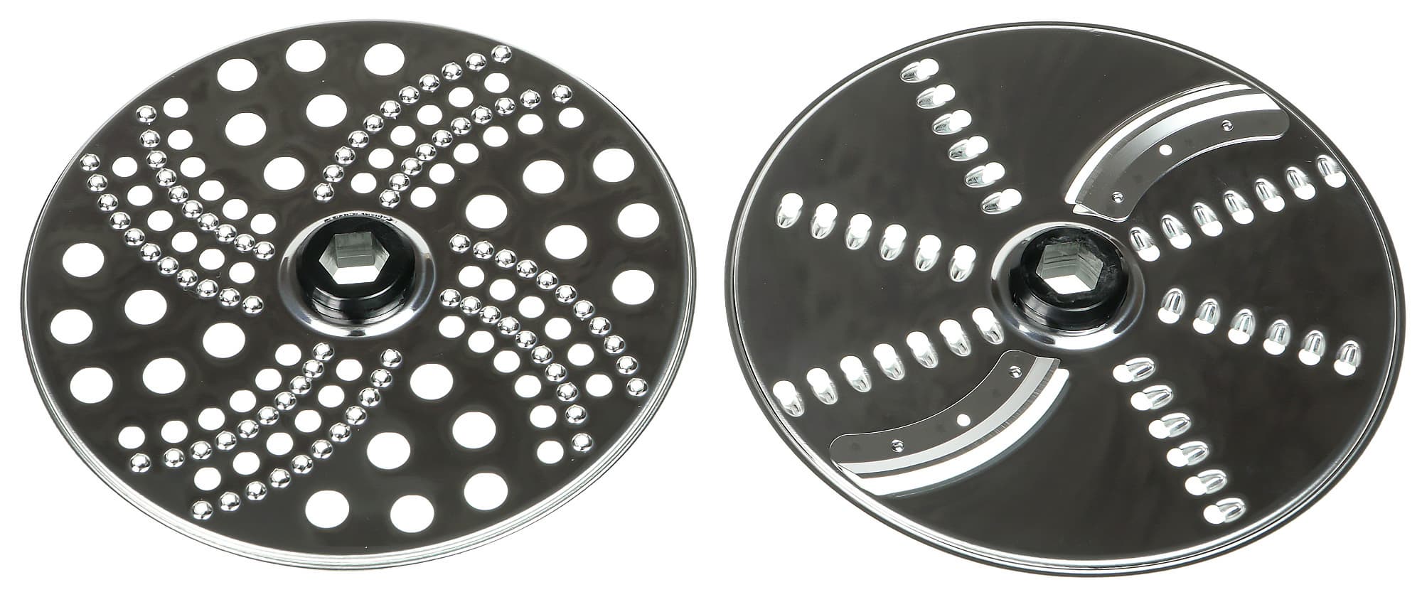 Если нужно собрать терку или шинковку — в большую чашу вставляется втулка-переходник, на нее надевается диск терки, сверху устанавливается крышка редуктора. Диск с крупной теркой и шинковкой двусторонний — с одной стороны терка, с другой шинковка.