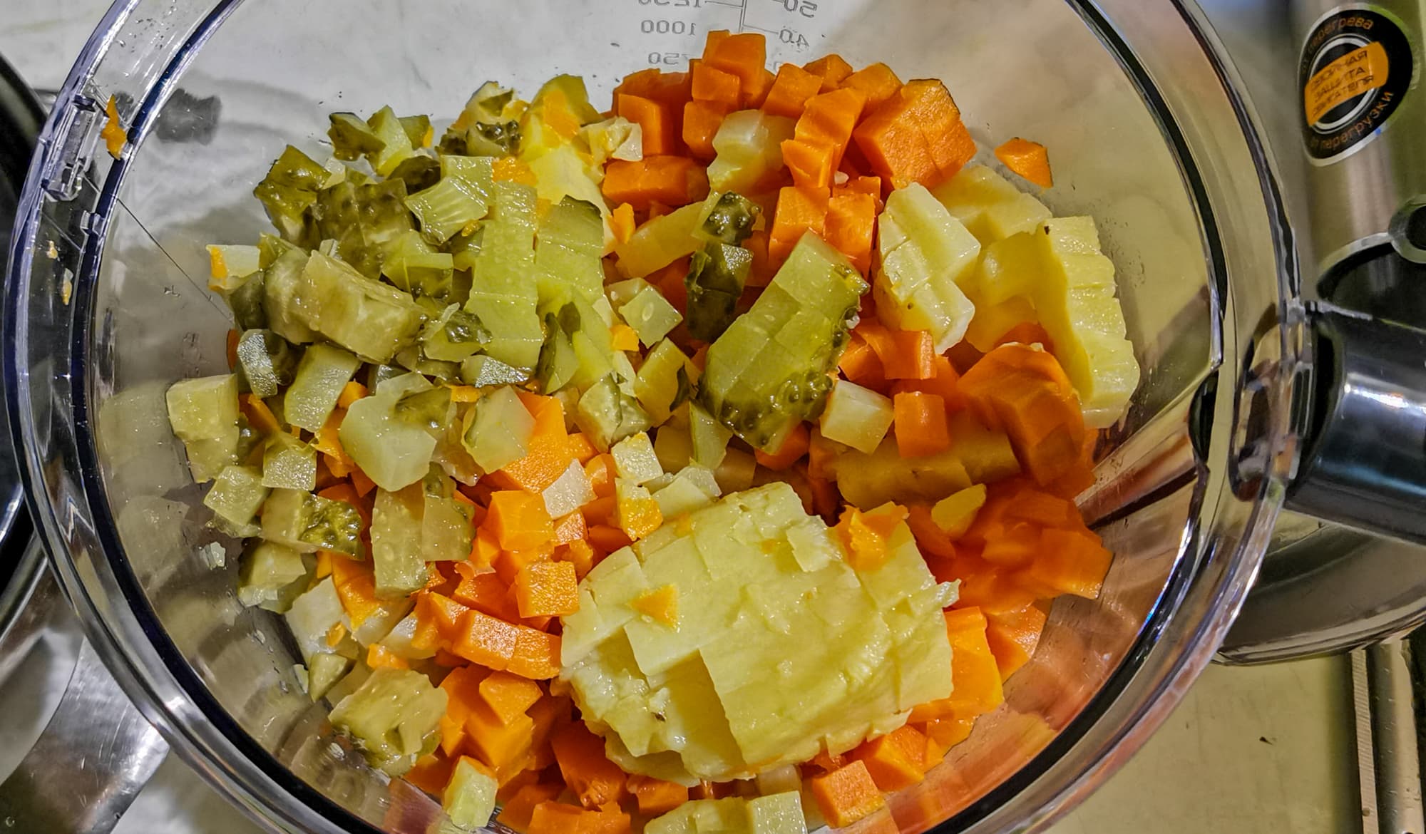 Мы знаем, как обычно надоедает строгать оливье на какой-нибудь праздник. Самая утомительная часть — это нарезка кубиками. Поэтому мы решили протестировать наш Redmond RHB-2964 именно на оливье. Вареная картошка, морковь и даже жесткий соленый огурец оказались нарезаны ровными аккуратными кубиками в одно мгновение. Картошку даже не приходилось толкать, она резалась под своим весом, а дореза́лась под весом следующей картофелины. Примерно через минуту у нас была целая большая чаша нарезанных овощей.