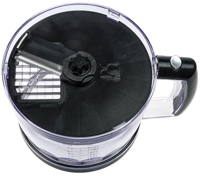 Насадка для нарезки кубиками представляет из себя плоский нож и пластиковый диск, вставляющийся в большую чашу, с решеткой в квадратном отверстии. Края решетки очень острые, для очистки решетки предусмотрено специальное устройство. Руками ее лучше не очищать, можно порезаться. Кнопка сбоку на ручке чаши служит для фиксации крышки-редуктора.
