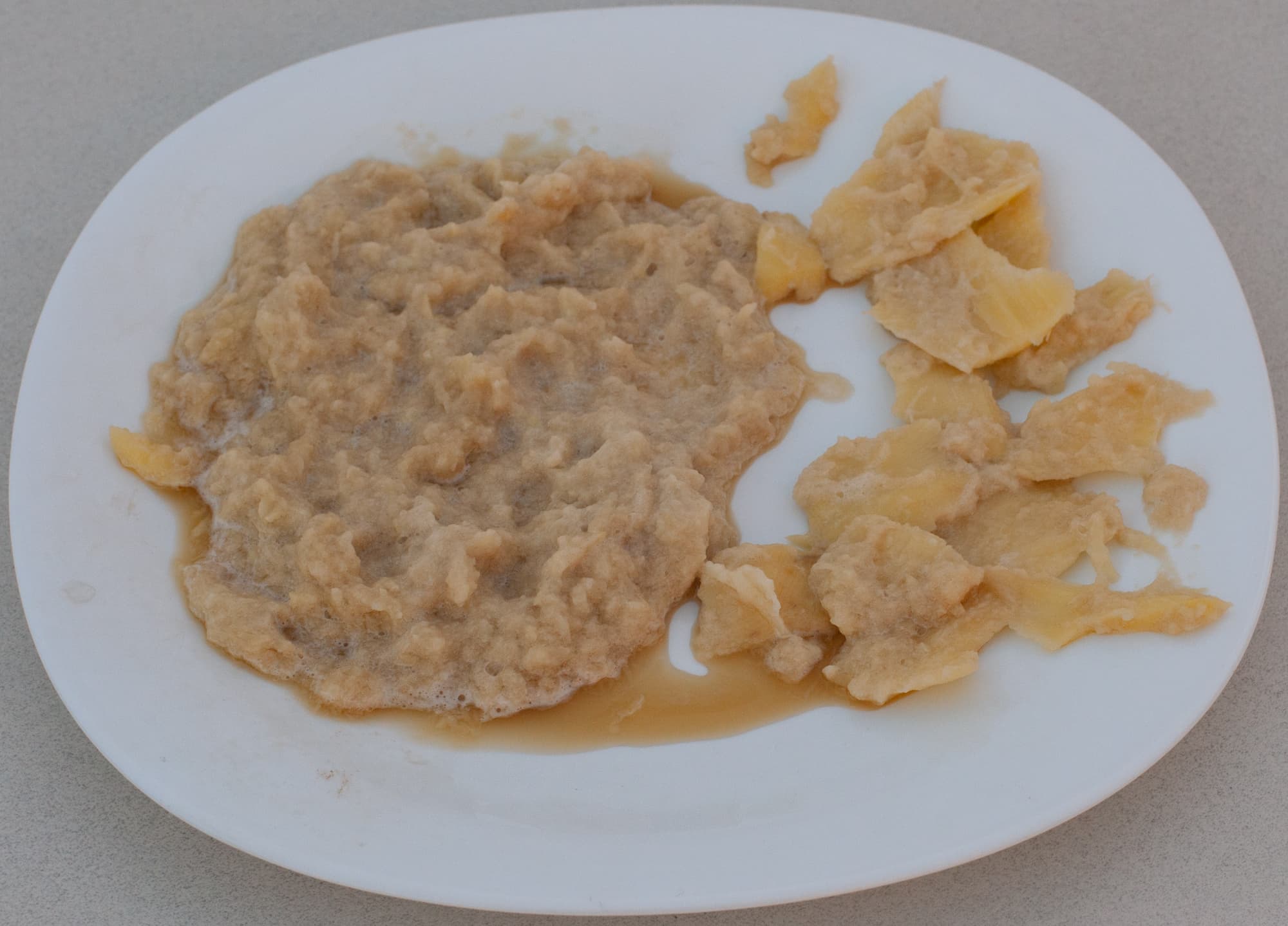На мелкой терке мы решили измельчить картофель на оладьи. Сырой картофель терся с определенным усилием, все-таки эта терка предназначена для более мягких продуктов — сыра, яиц, вареных овощей. Остатки картофелины вылетали с диска терки под воздействием центробежной силы в щель между диском и чашей. В результате они смешались с натертой массой и их пришлось из нее вылавливать. В остальном картофель натерся неплохо.