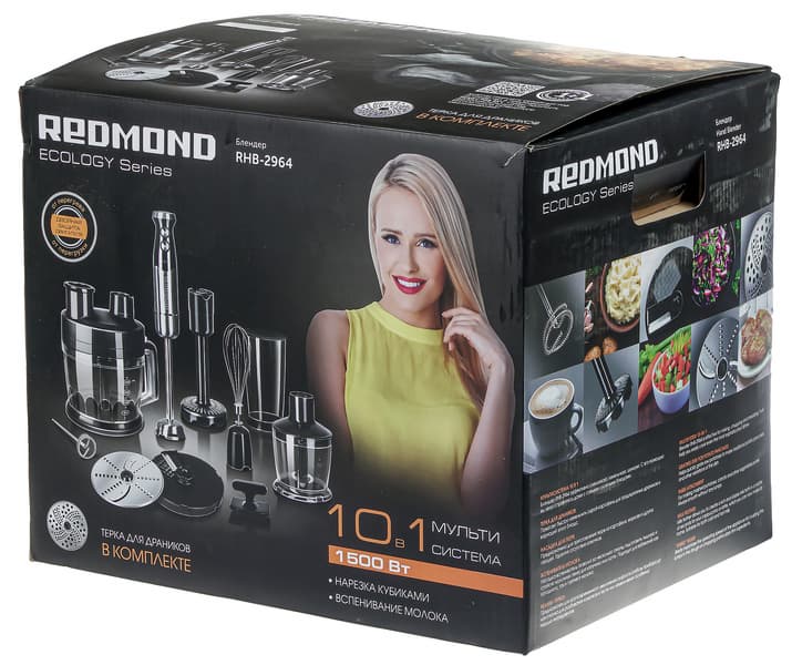 Блендер пришел на тестирование в большой картонной коробке черного цвета. На коробке, как обычно у Redmond, женский портрет, фотография прибора со всеми комплектующими, несколько красивых фотографий блюд, приготовленных с помощью блендера, и техническая информация о приборе. Сбоку на коробке прорези для удобства переноски. Внутри коробки сам прибор и все отдельные детали тщательно упакованы в защитные полиэтиленовые пакеты и картонные вставки.