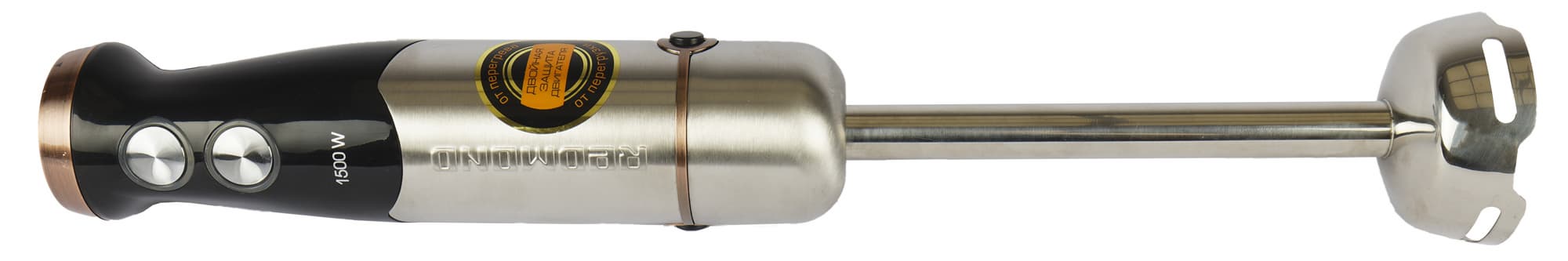 Корпус моторного блока устройства выполнен из черного глянцевого пластика. Нижняя половина закрыта листом из нержавеющей стали с логотипом Redmond. Несмотря на то, что пластик глянцевый, выглядит он не слишком блестящим, а значит, и отпечатки пальцев собирает не слишком сильно.