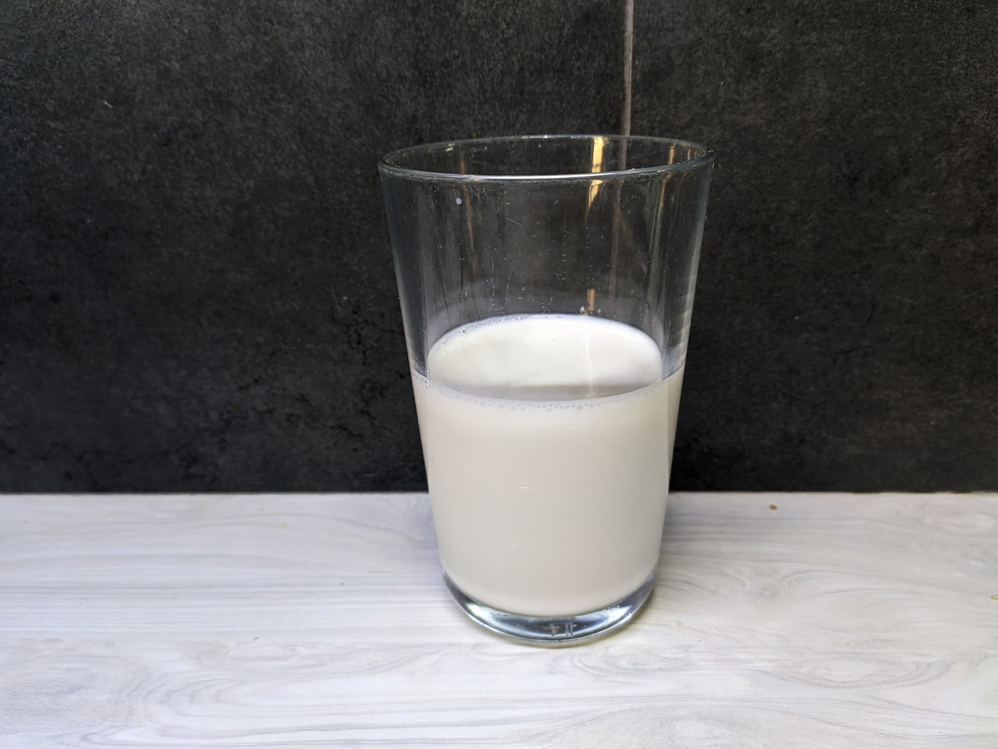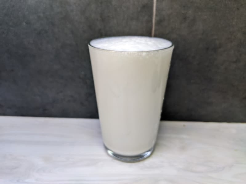 Теперь проверим, как блендер работает в качестве капучинатора. Мы взяли предварительно подогретое молоко и начали его взбивать. Вот столько молока было в стакане изначально: