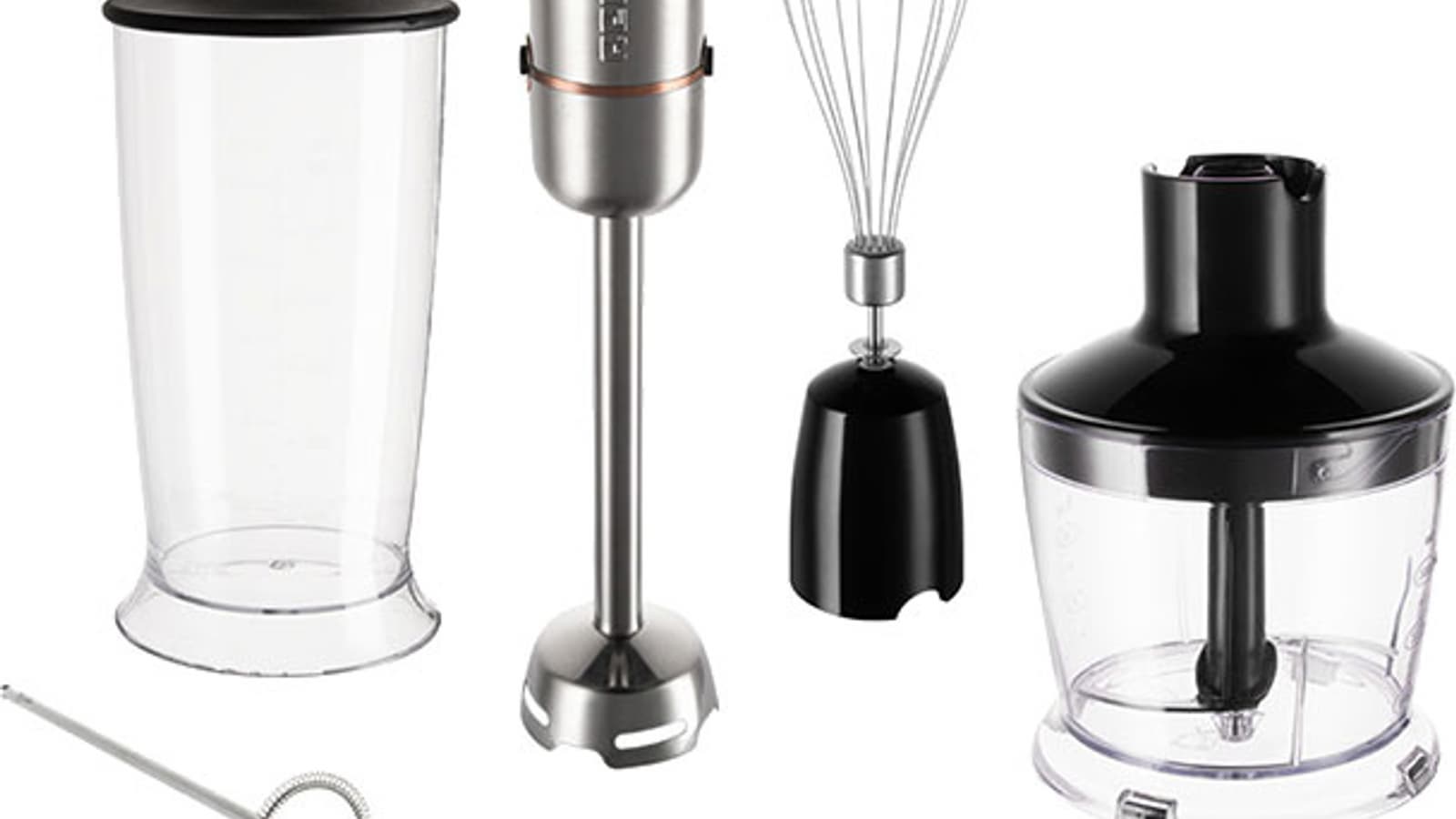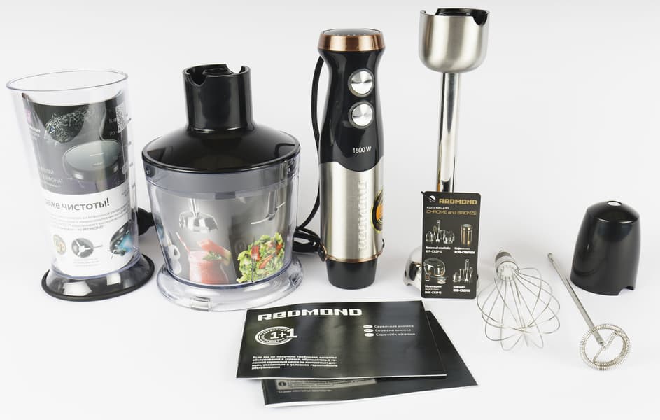 Герой нашего сегодняшнего обзора — вполне классический блендер «3 в 1», оснащенный стандартной насадкой для блендирования, венчиком для взбивания и чашей для измельчения (с двухлопастным ножом). В общем, и форма, и конструкция, и комплектация у Redmond RHB-CB2986 классические. Никаких сюрпризов, с нашей точки зрения, тут не предвидится. Единственный не совсем обычный аксессуар — венчик для взбивания молочной пены — должен понравиться любителям кофейных напитков с молоком. Так что прибор имеет полное право называться «4 в 1», а не «3 в 1».